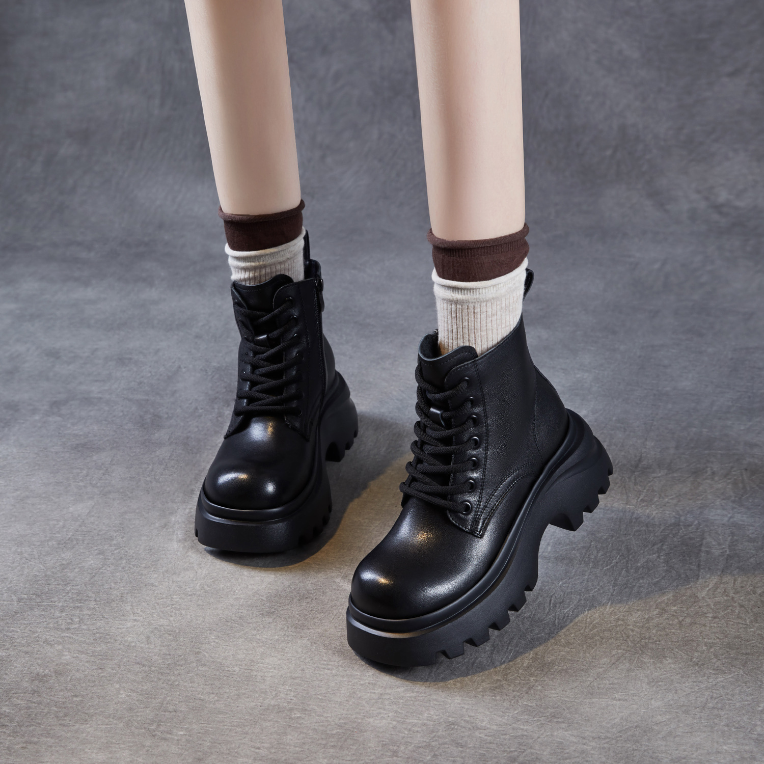 马丁靴女2025秋冬新款复古英伦风真牛皮靴子大头增高厚底系带短靴