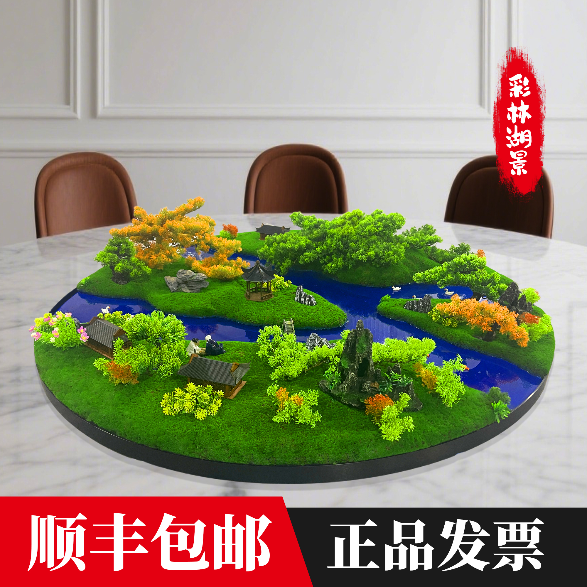 酒店圆桌造景摆件大餐桌中间转盘摆花会所茶室摆放假花苔藓微景观