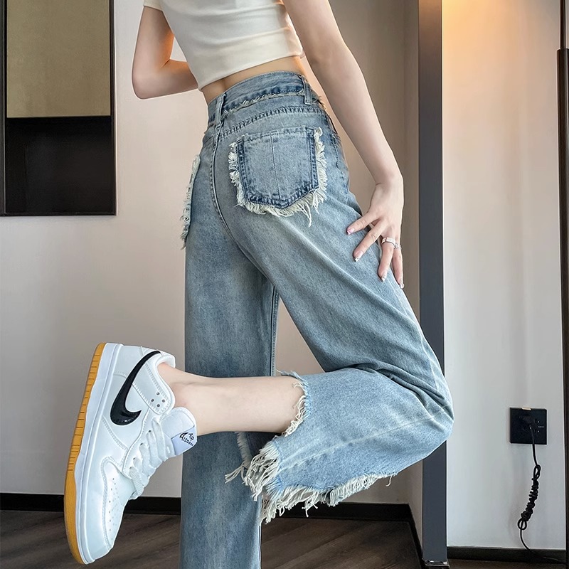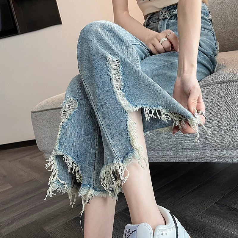 阔腿牛仔裤女2024年新款夏季薄款小个子高腰直筒破洞毛边九分裤子