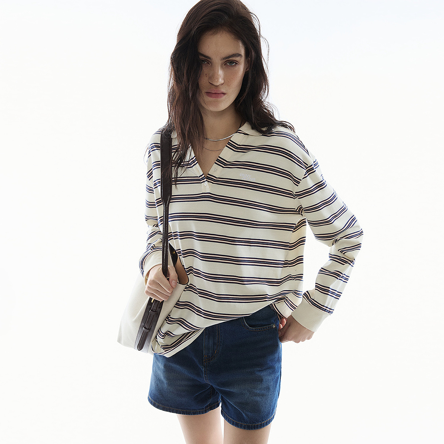 DKNY唐可娜儿26春季新款长袖Polo衫女条纹T恤时尚美式复古风上衣