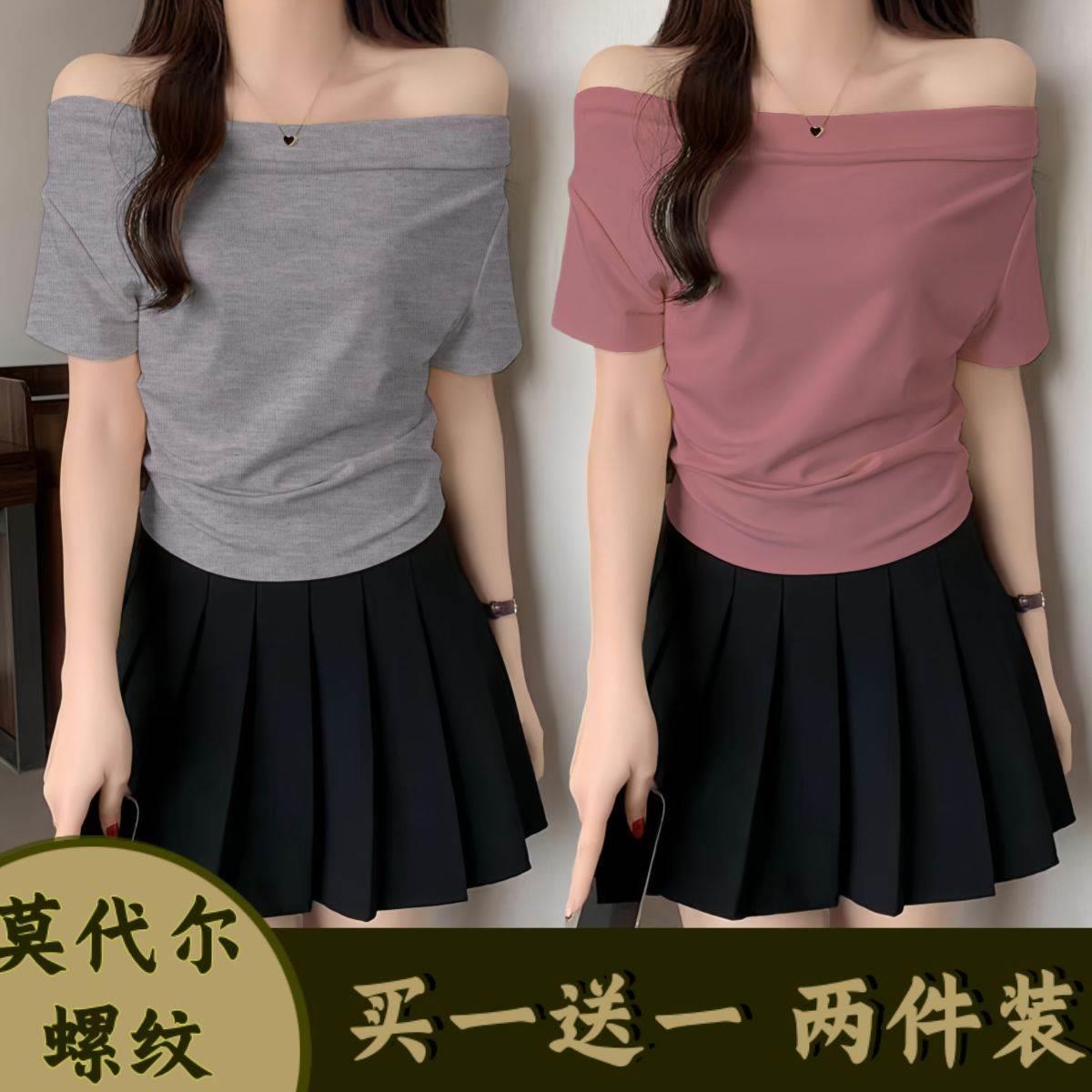 单/两件 纯色一字肩上衣女夏季设计感小众露肩荡领显瘦短袖t恤衫