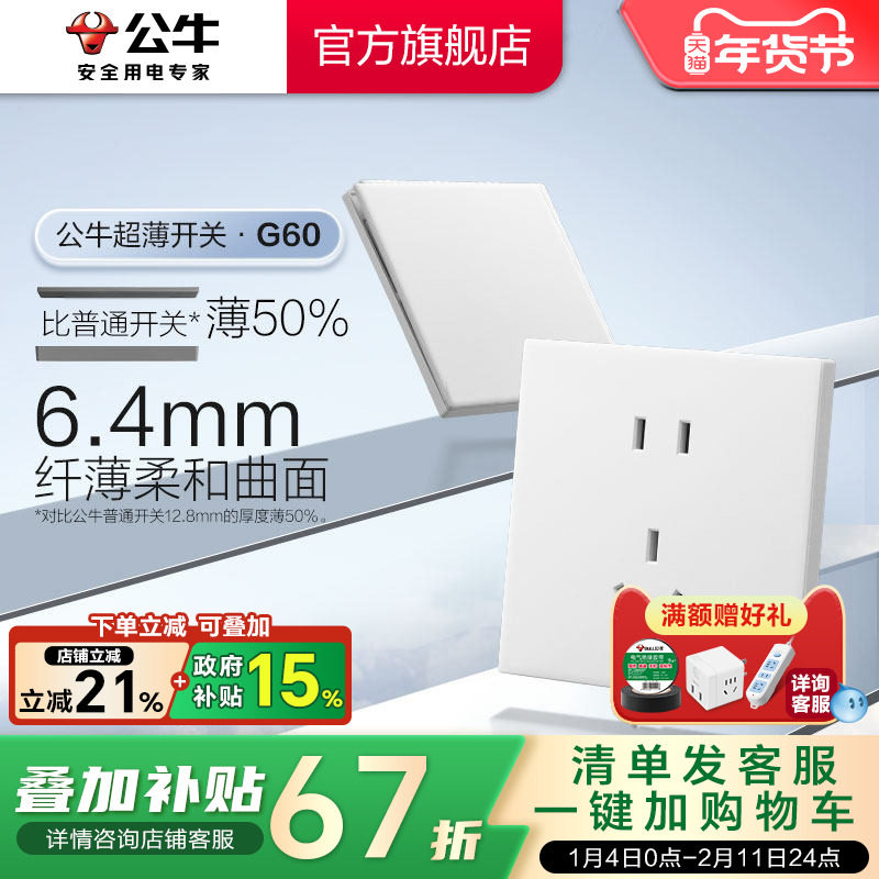 公牛官方旗舰超薄G60开关五孔插座16a面板哑光奶油风墙壁暮雪白