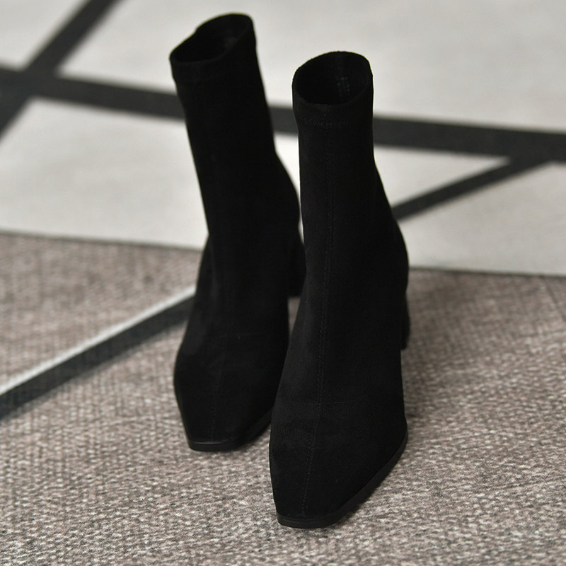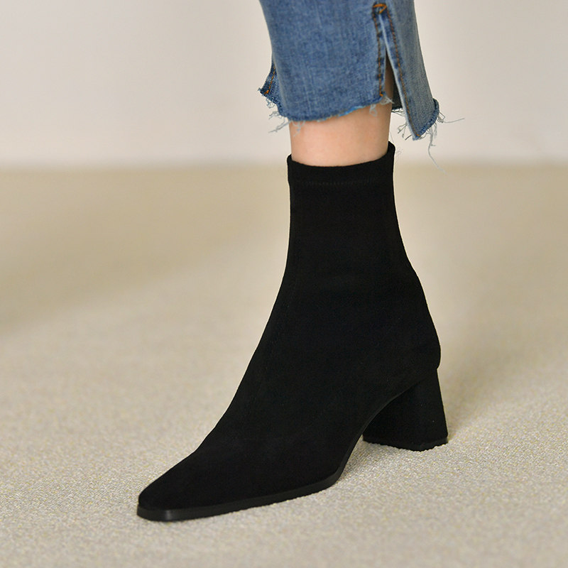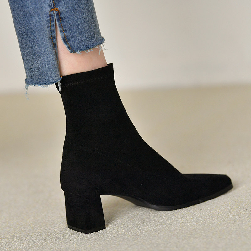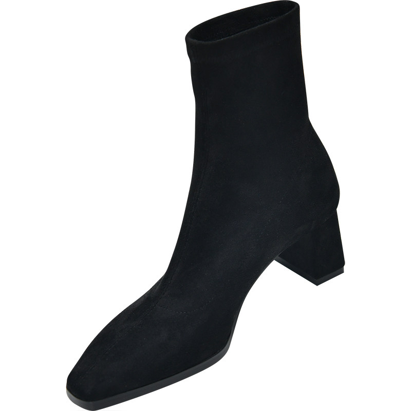 皮厚先生 小方头粗跟短靴女套筒黑色瘦瘦靴 高跟及踝靴春秋女靴子