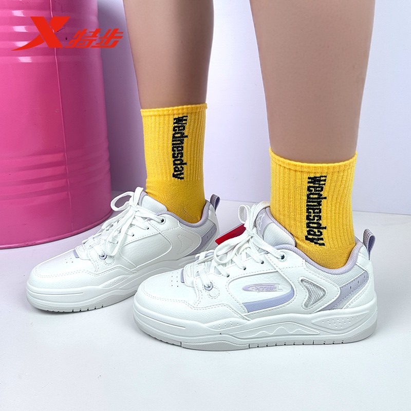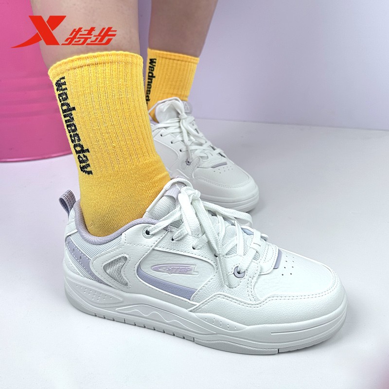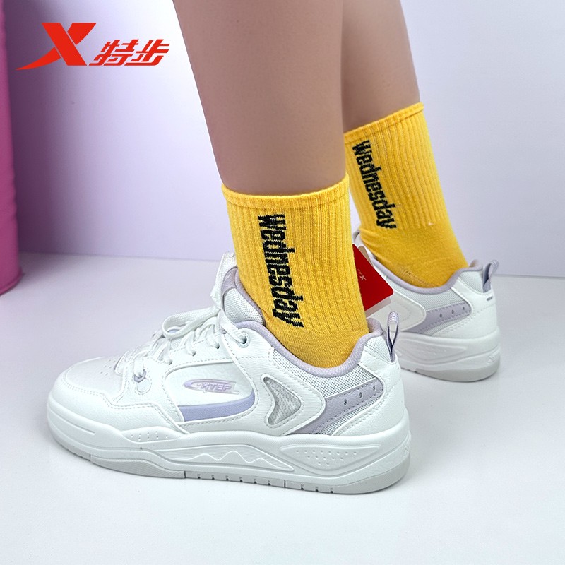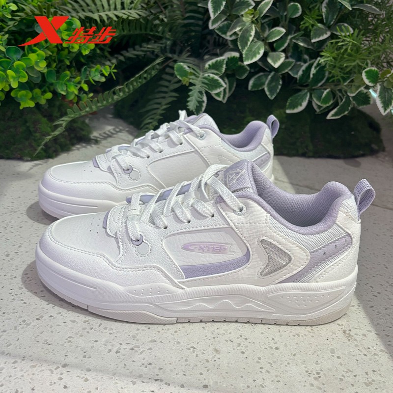 特步云帆板鞋女2025秋季新款小白鞋皮网运动休闲板鞋975318310060