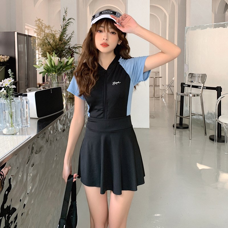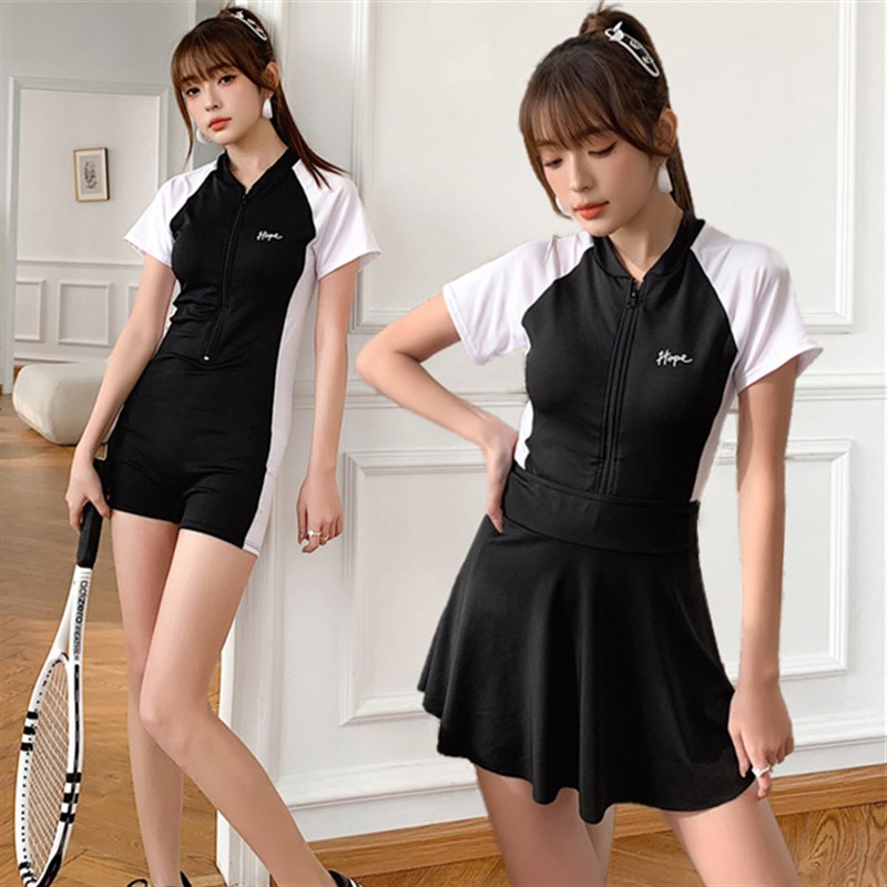 裙式保守泳衣女连体平角显瘦泡温泉运动风竞技学生小胸聚拢游泳装