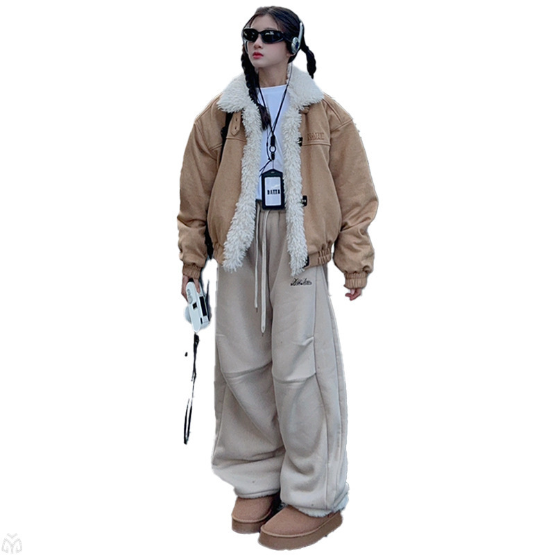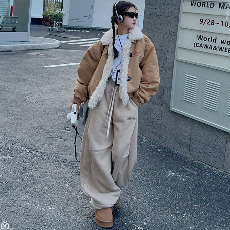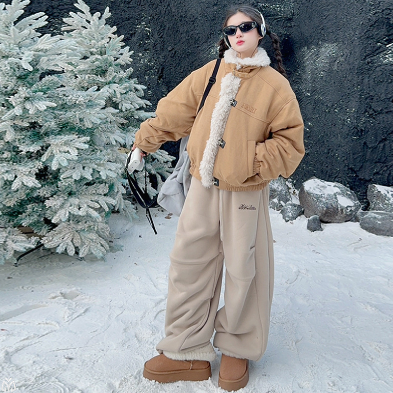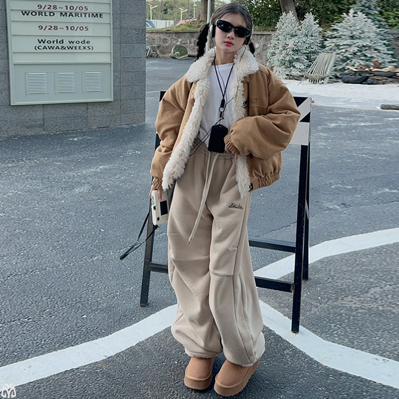 女童套装冬季2025新款洋气拼接羊羔毛外套宽松百搭加厚羊羔毛
