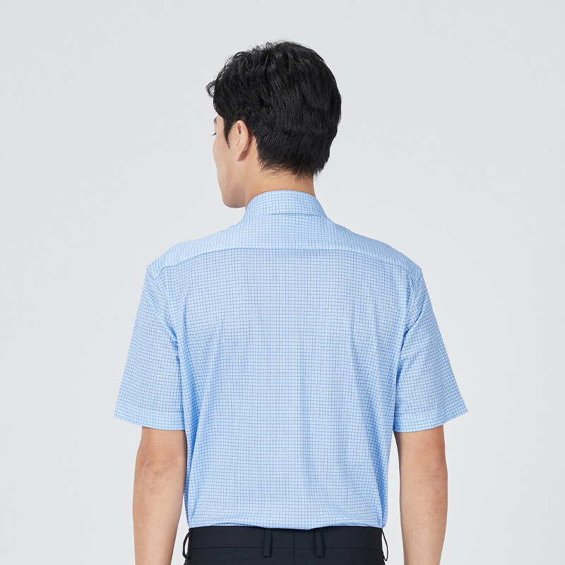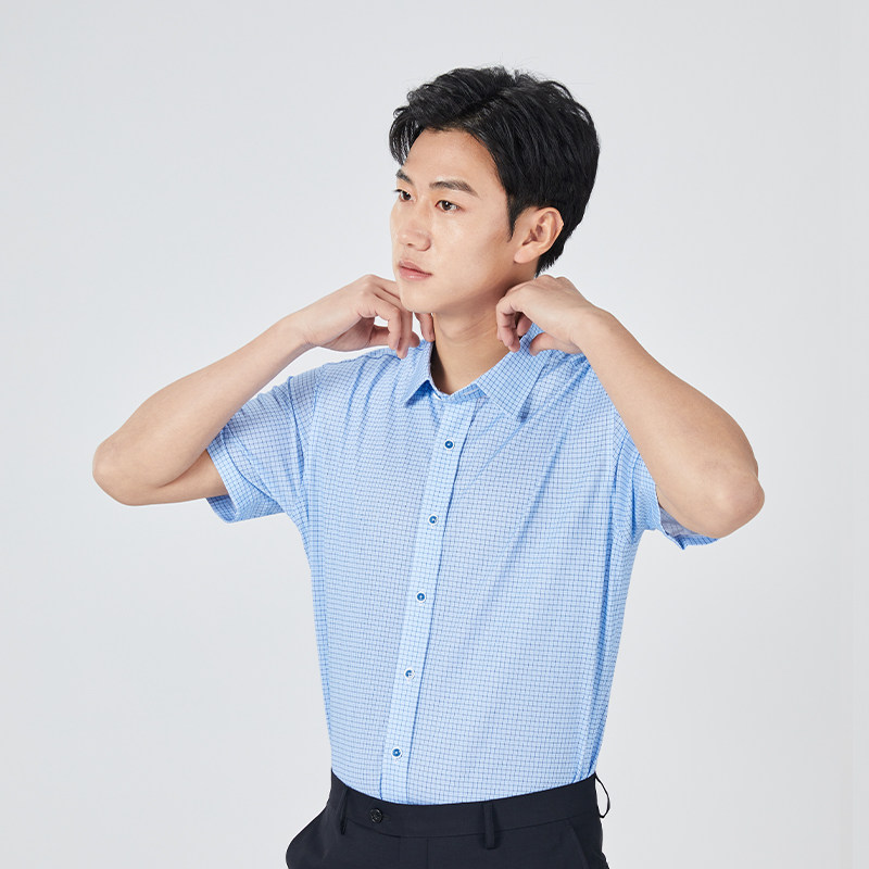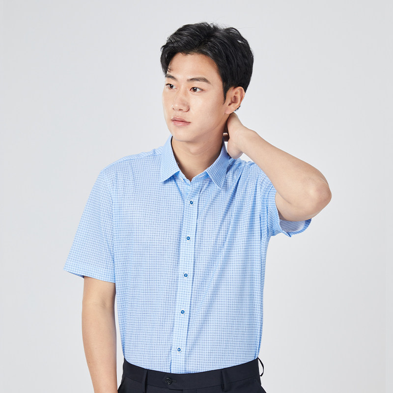 【针织】乔治白夏男士短袖衬衫尖领蓝格衬衣休闲修身透气微弹上衣