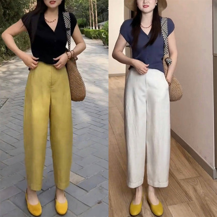 天丝亚麻气球裤女2026夏季款高腰小个子九分裤垂感垂感麻料哈伦裤