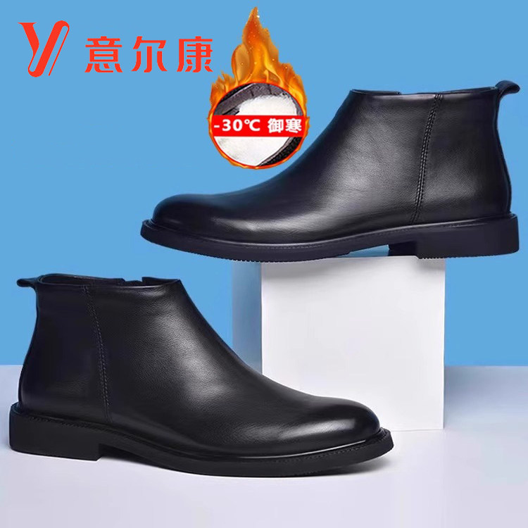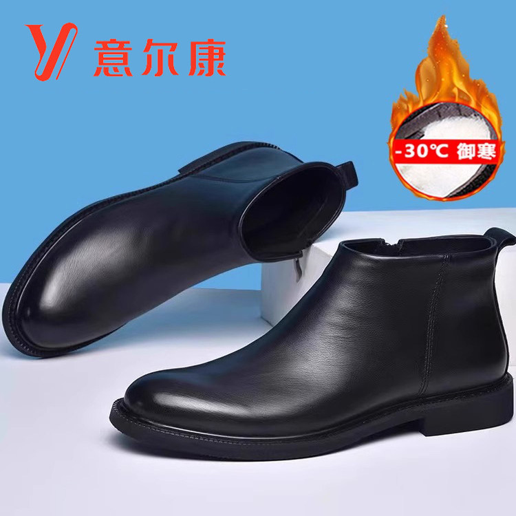 意尔康皮鞋牛皮高帮切尔西皮鞋男士加绒保暖雪地靴真皮加棉马丁靴
