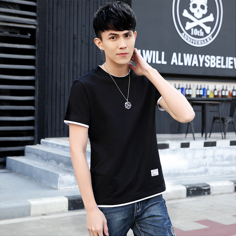 潮牌假两件t恤男短袖港风黑白拼接痞帅纯色简约百搭宽松纯棉上衣