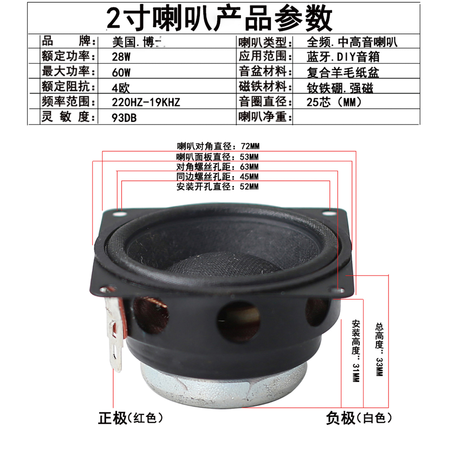 2寸美国博S全频喇叭 2寸4欧中高音喇叭人声毒 拆箱扬声器唛头