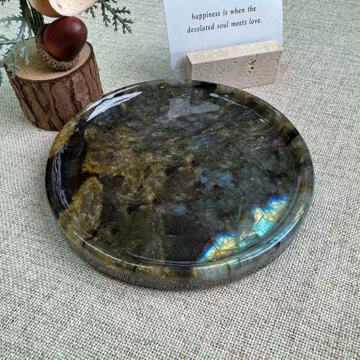 水晶拉长石原石托盘圆盘月光石摆件蓝翡翠奢石水晶雕刻工艺品