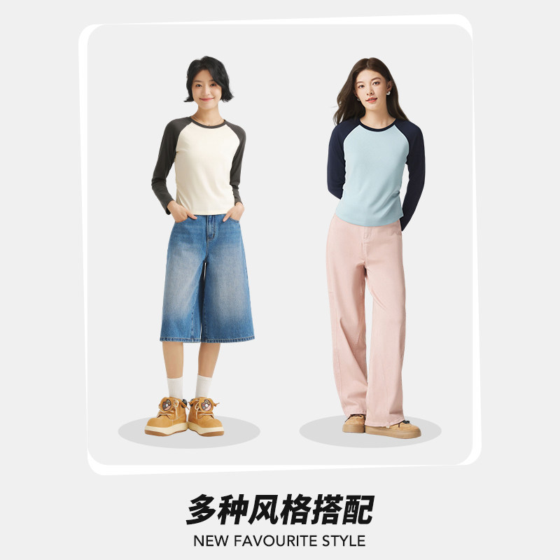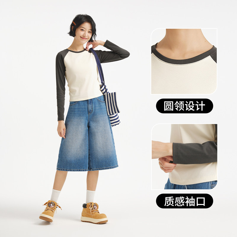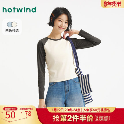 热风女士长袖T恤上衣2025年秋季新款收腰显瘦插肩长袖T韩系内搭T