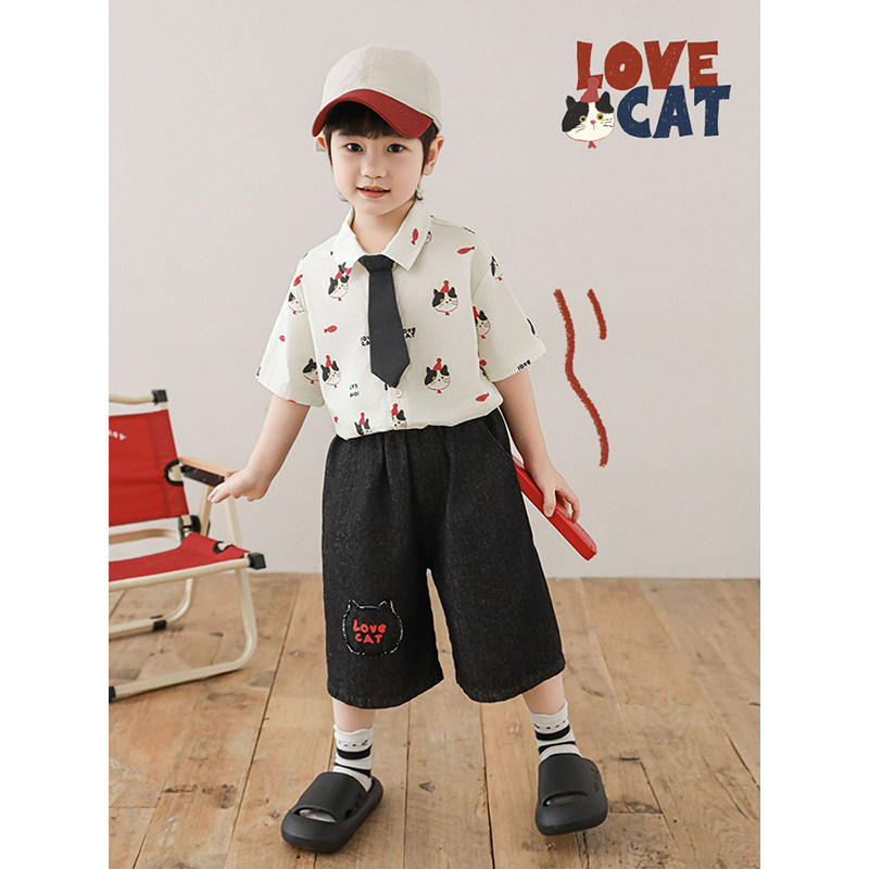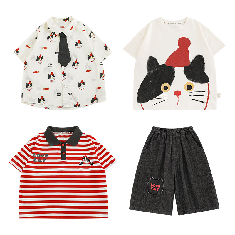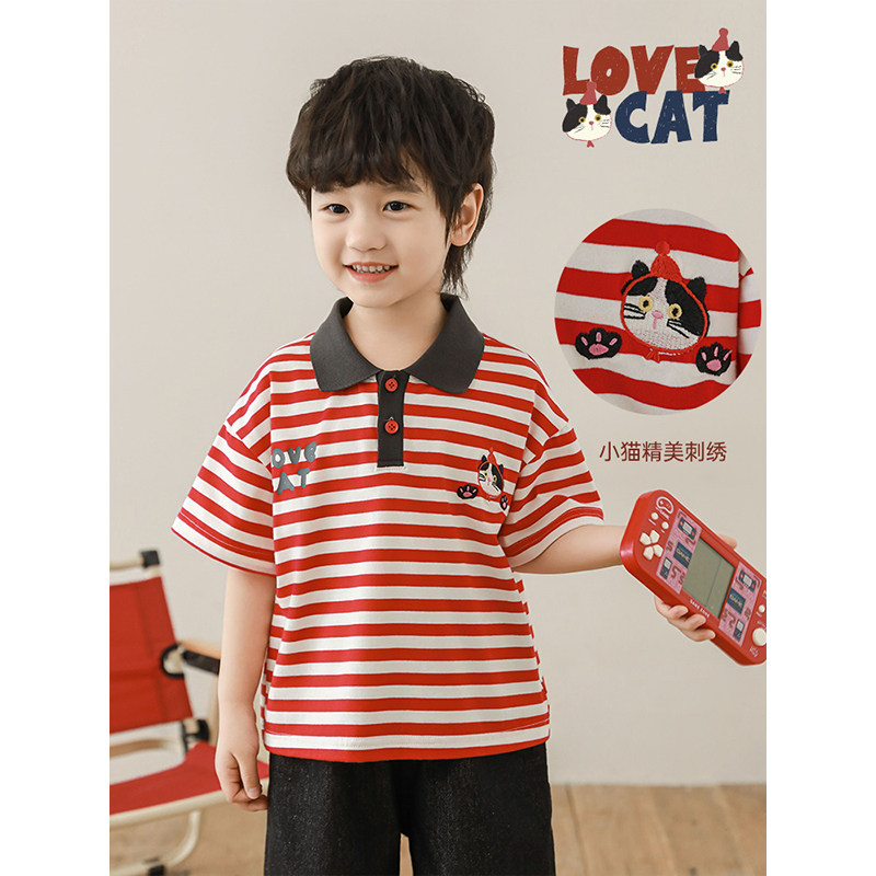幼悠 男童夏季新款条纹polo领t恤翻领衬衫宽松短裤猫咪系列套装潮