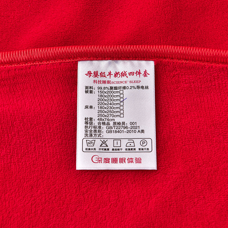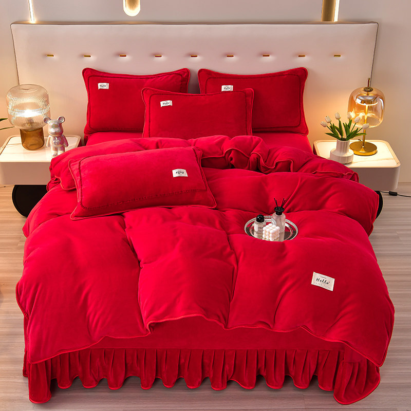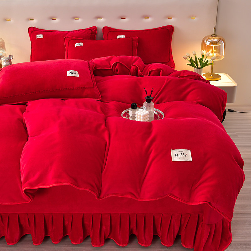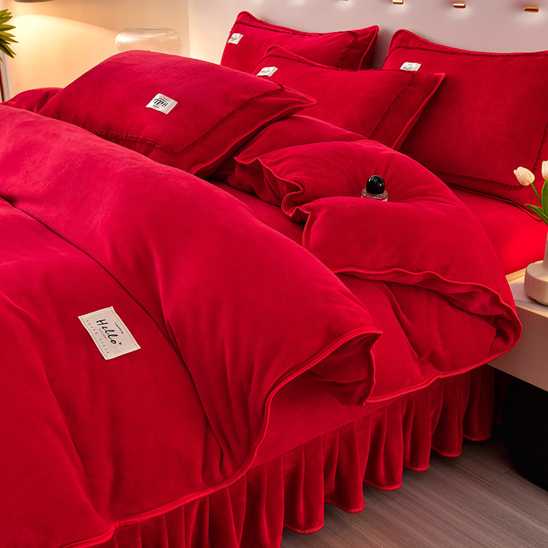 冬季加绒牛奶绒床上四件套双面加厚法兰珊瑚绒大红色结婚床单被套