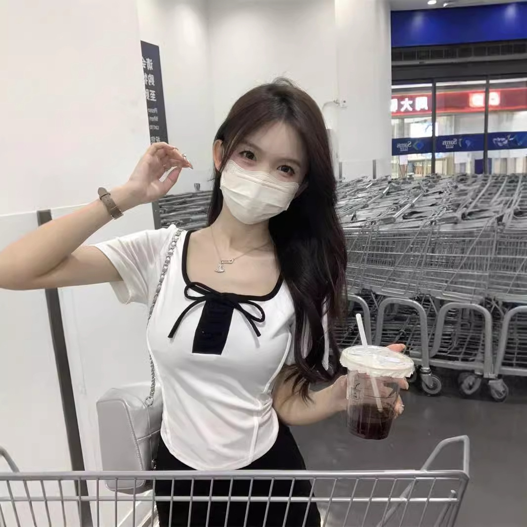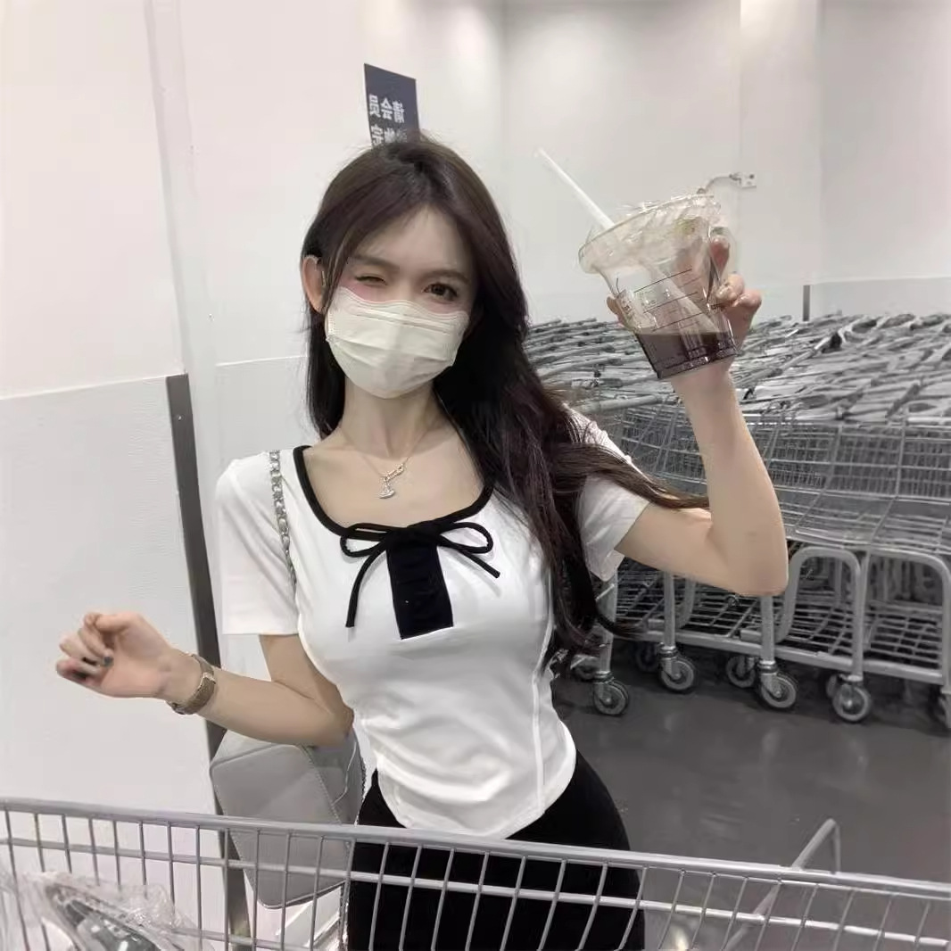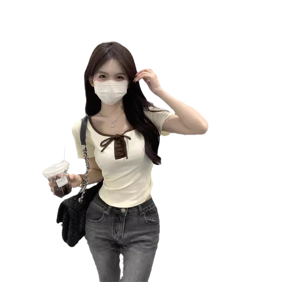 设计感拼色方领绑带短袖T恤女夏新款修身显瘦纯欲风辣妹上衣潮流