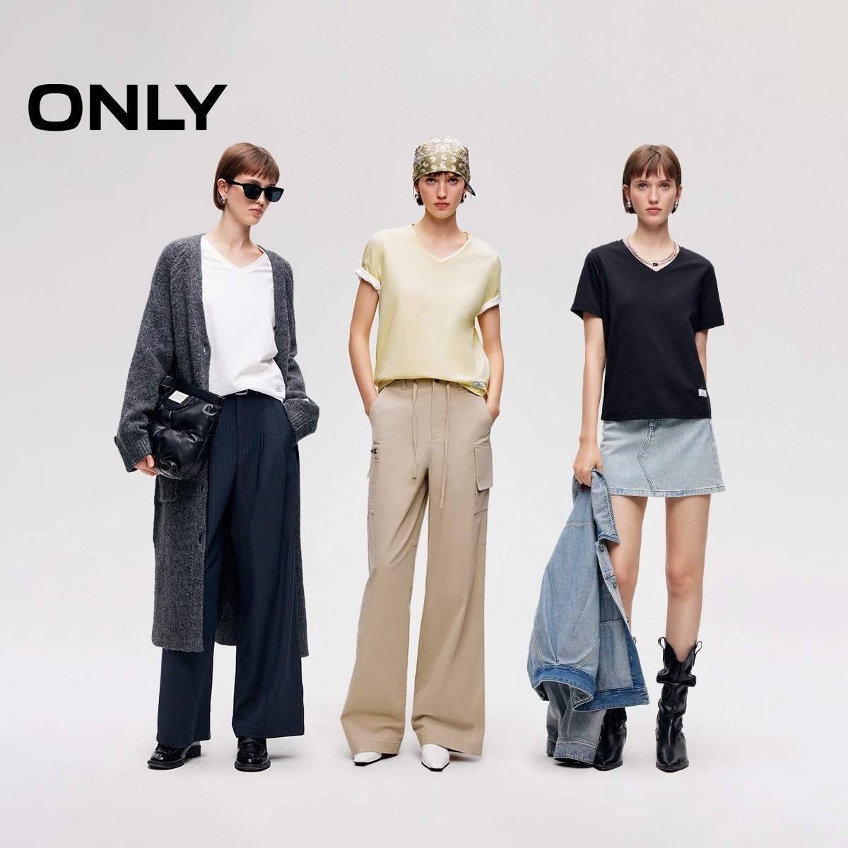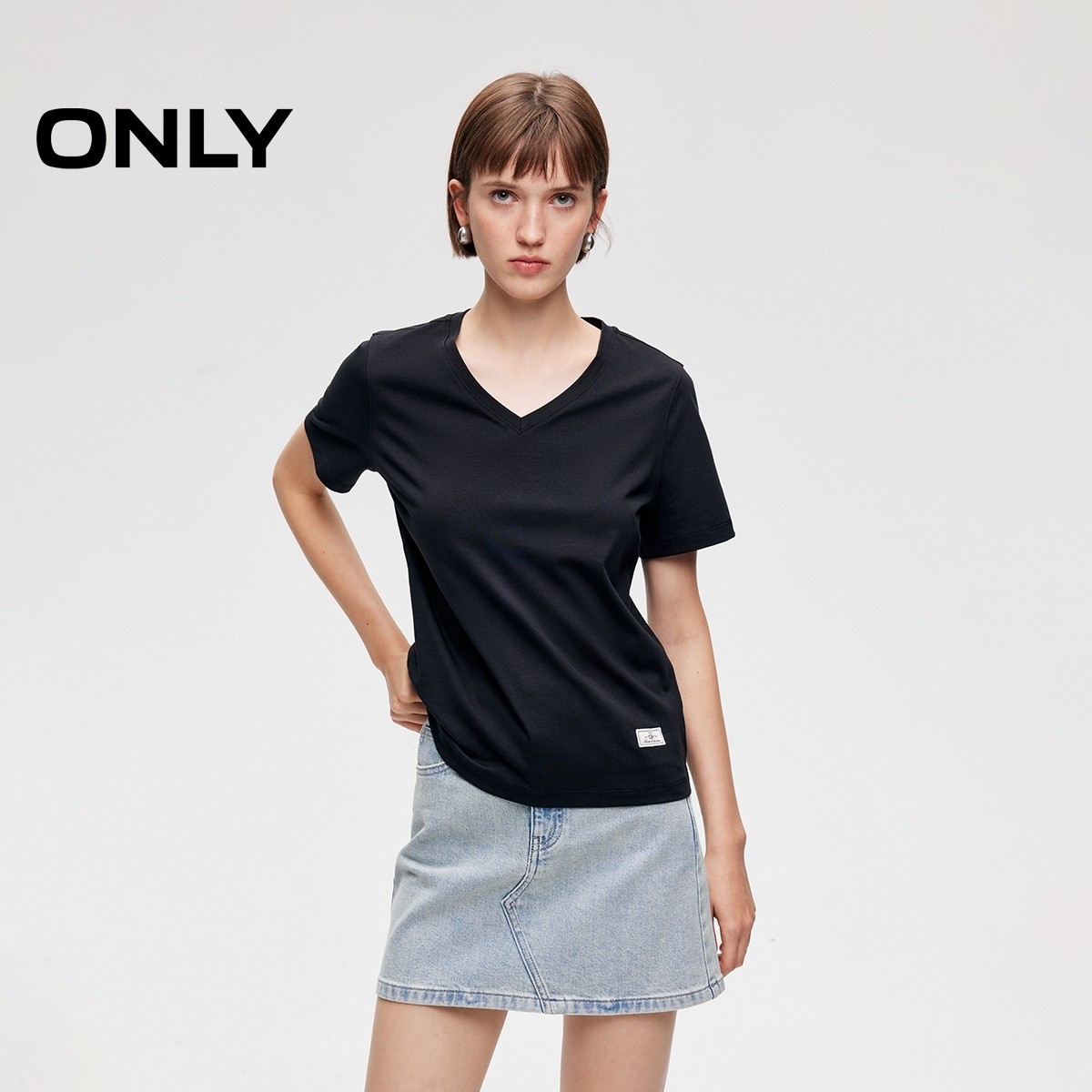 绫致ONLY2026春季新款合体正肩简约纯色显瘦直筒V领T恤女