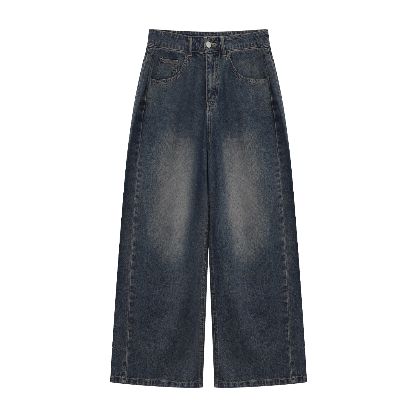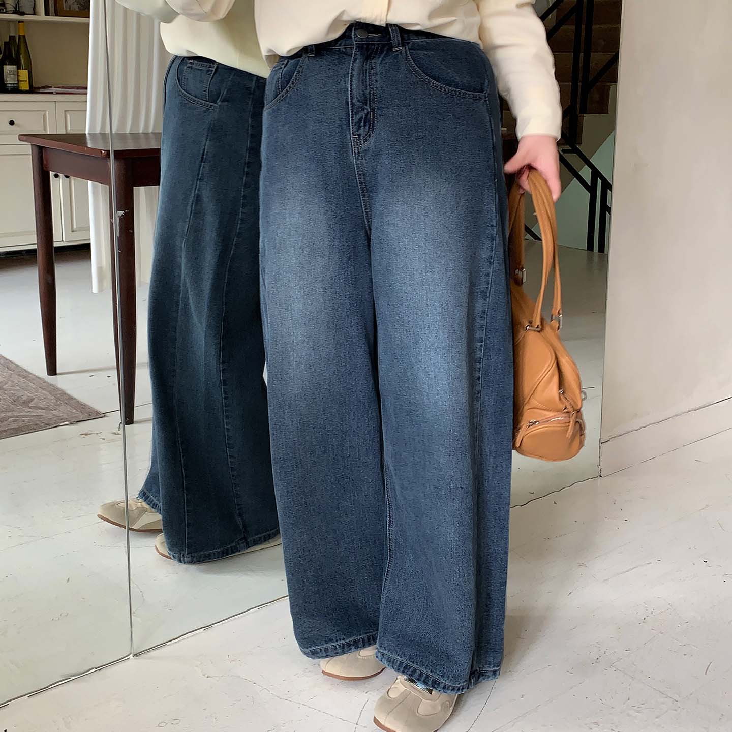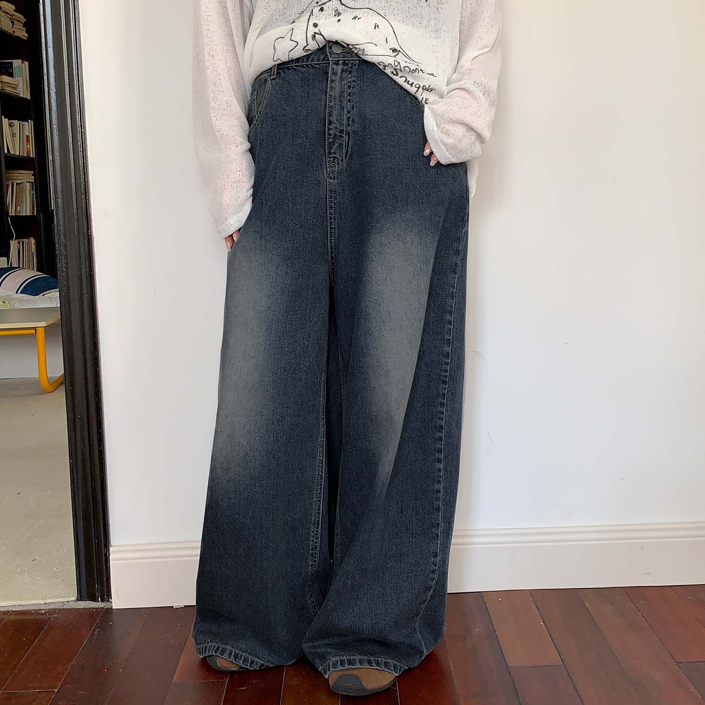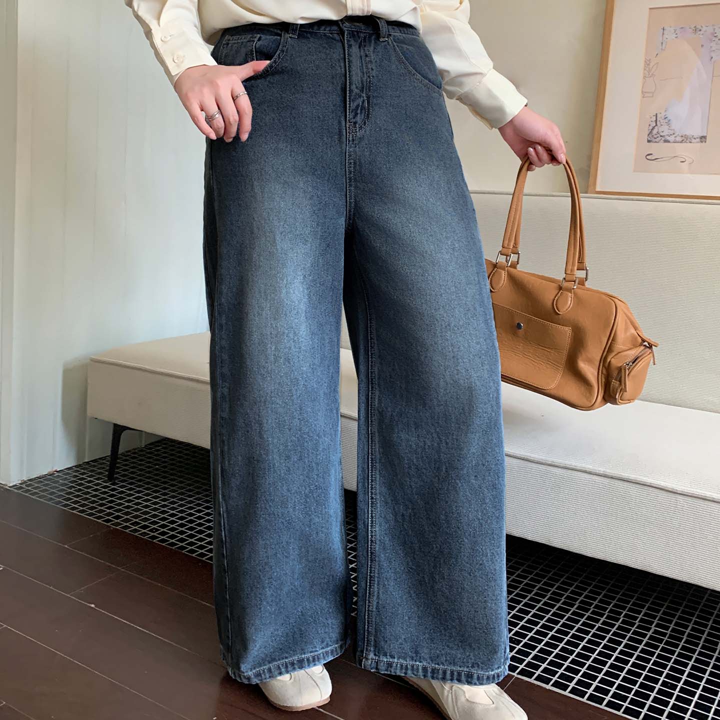 YUZI 鱼子高腰牛仔裤特大码女装胖mm秋冬复古做旧阔腿垂坠感宽松