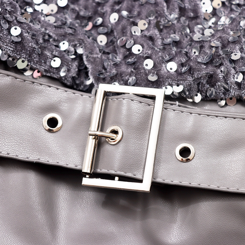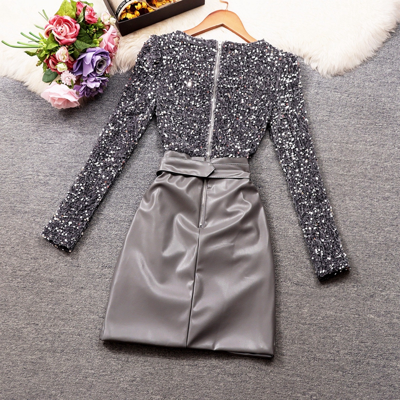 实拍秋季新品韩版女装重工亮片拼皮修身显瘦褶皱包臀裙V领连衣裙
