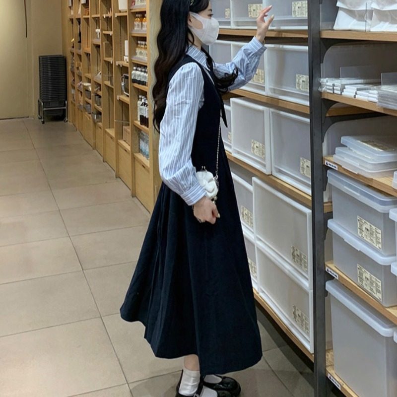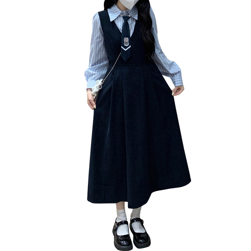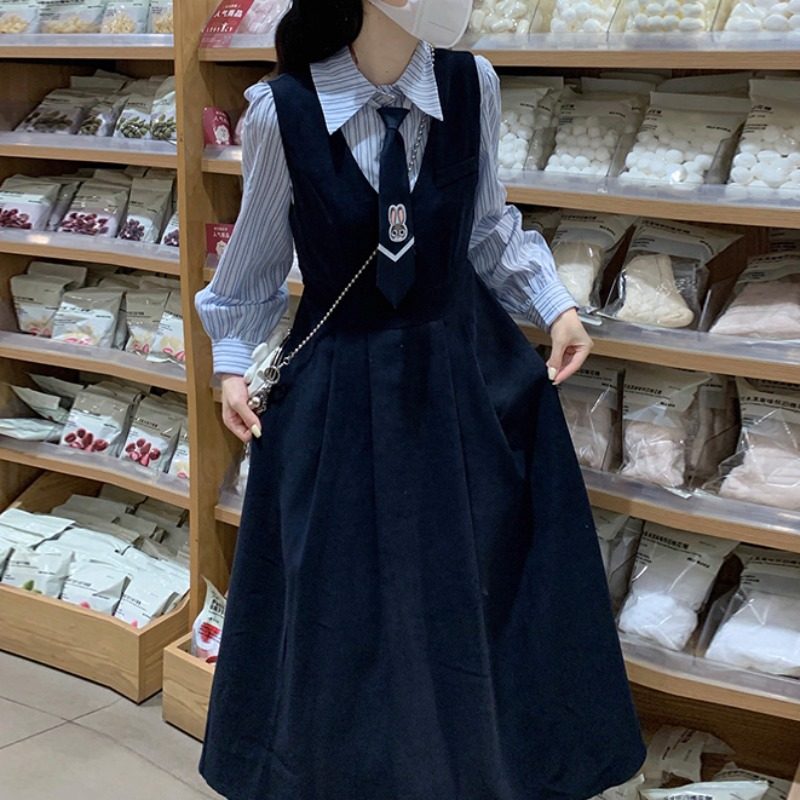 兔子警官~复古甜美学院风领带条纹衬衫背带连衣裙两件套装遮肉裙