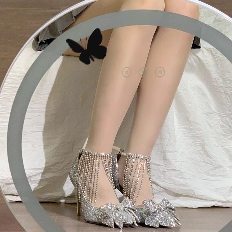 仙女风尖头单鞋秋冬新款银色亮片水钻蝴蝶结细跟高跟鞋女新娘婚鞋
