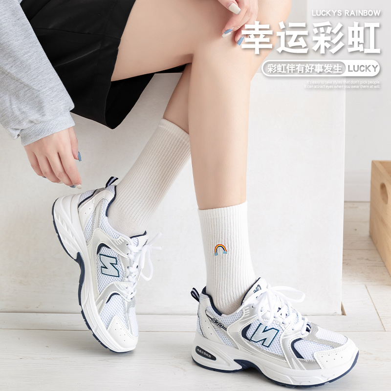 白色袜子女中筒袜ins潮春秋可爱日系彩虹纯棉秋冬运动长筒袜男夏
