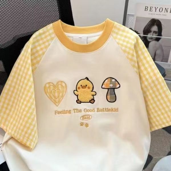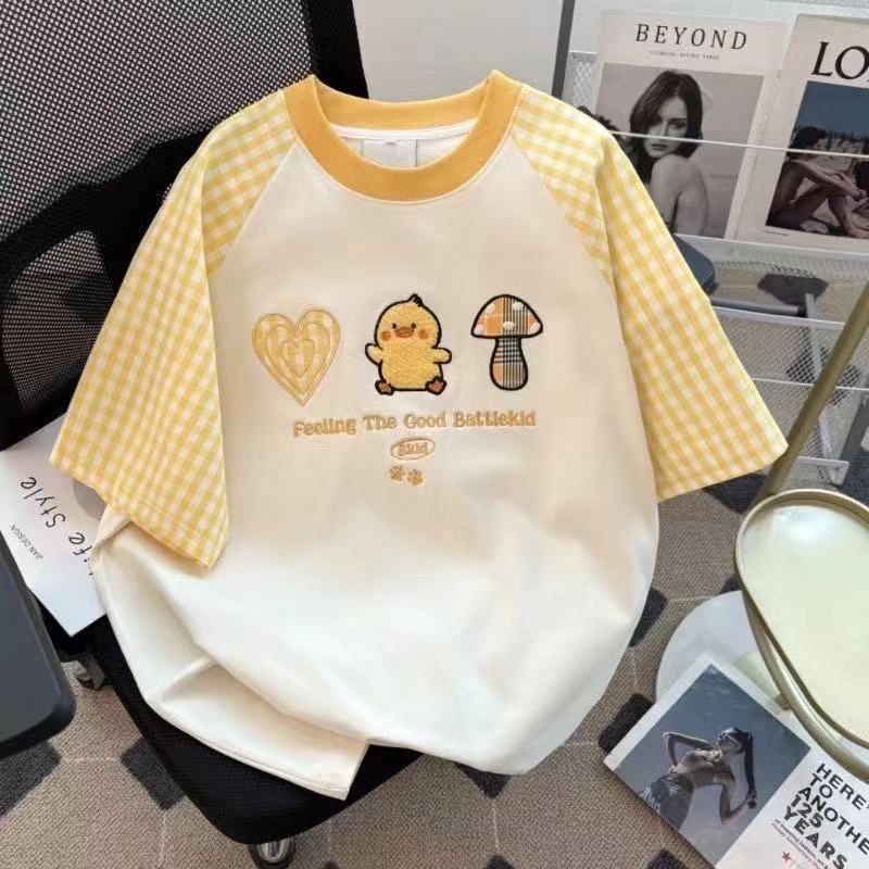 刺绣小鸭格子2025夏季新款圆领短袖T恤女宽松学院风上衣休闲百搭