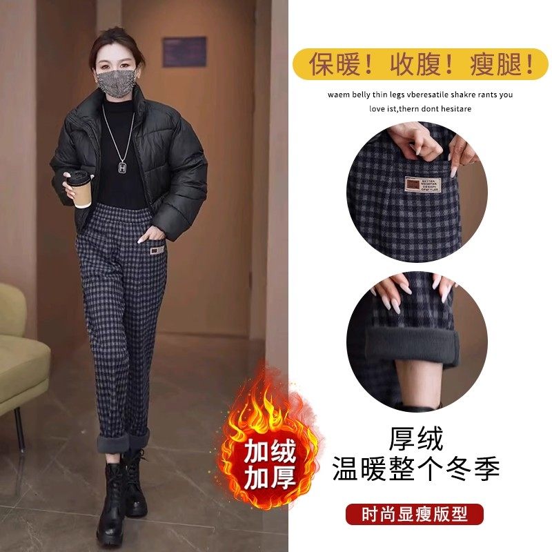 清仓捡漏~加绒加厚毛呢格子哈伦裤女秋冬小脚裤高腰显瘦休闲裤子