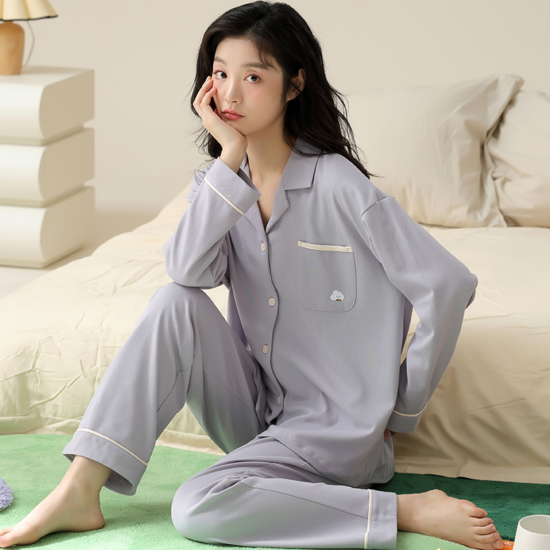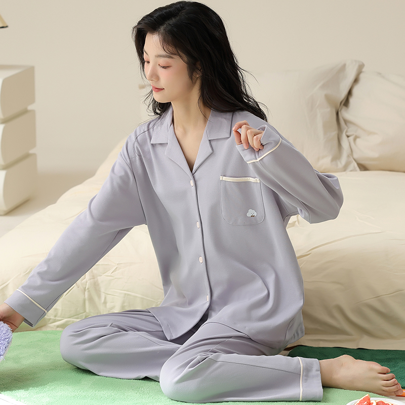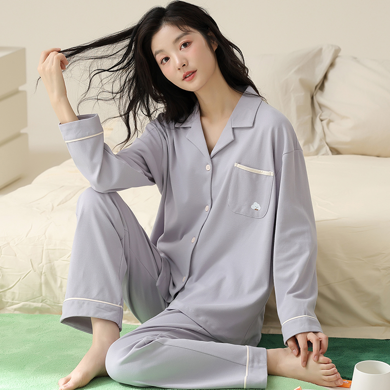卡之恋纯棉睡衣长袖春秋季薄款温柔紫色日系衬衫式套装全棉家居服