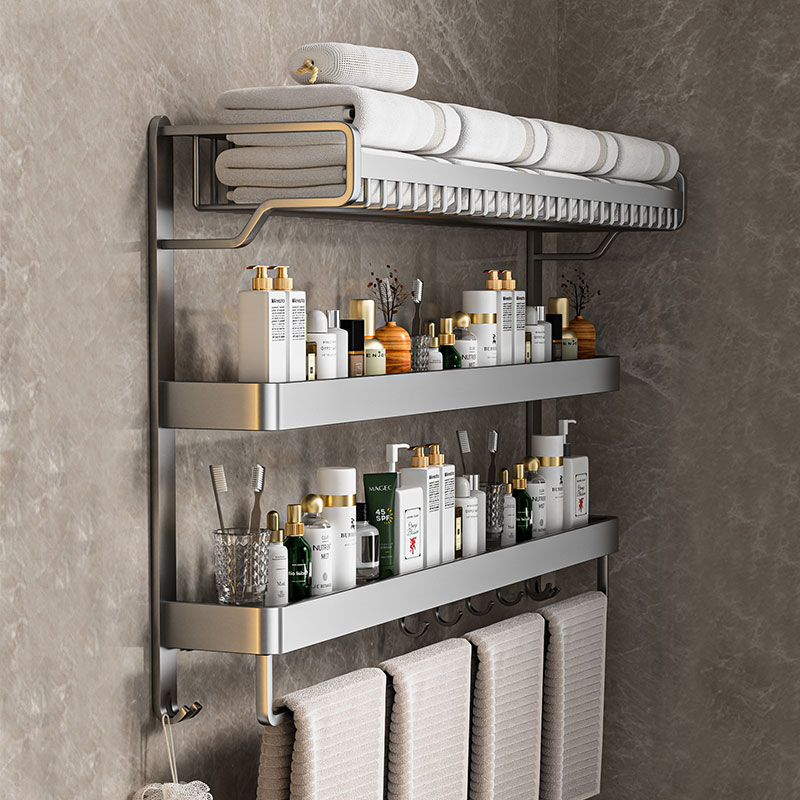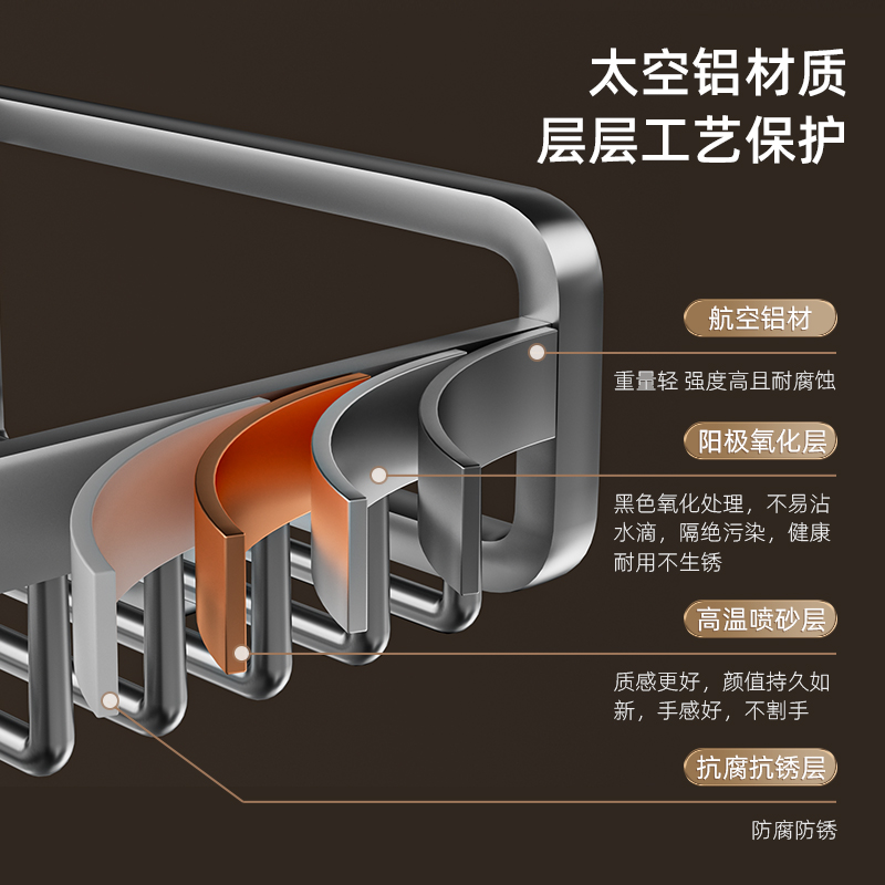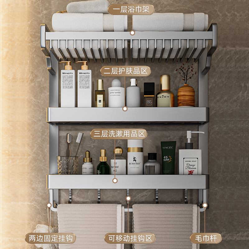 卫生间毛巾架置物架一体浴室x免打孔厕所枪灰浴巾架太空铝卫浴双