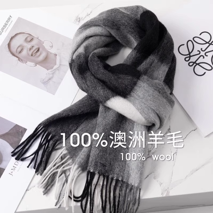 圣诞100%澳洲羊毛格子围巾女秋冬季百搭男保暖情侣窄围脖生日礼物