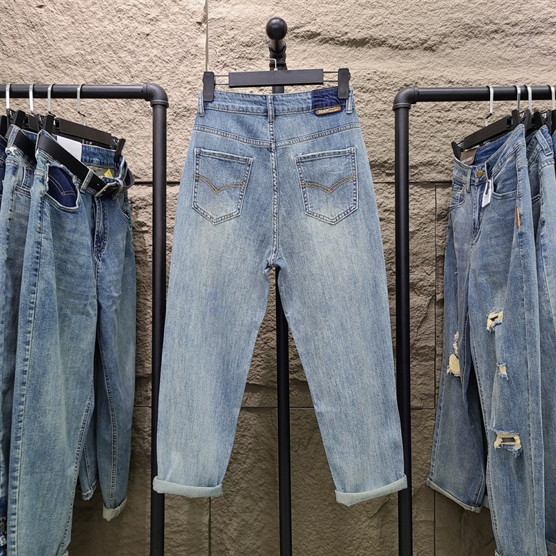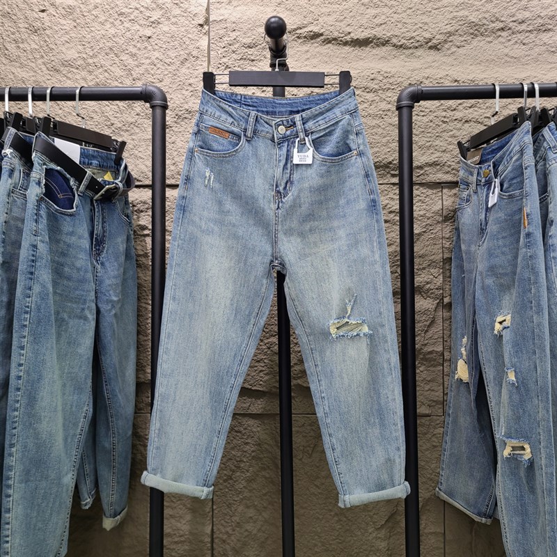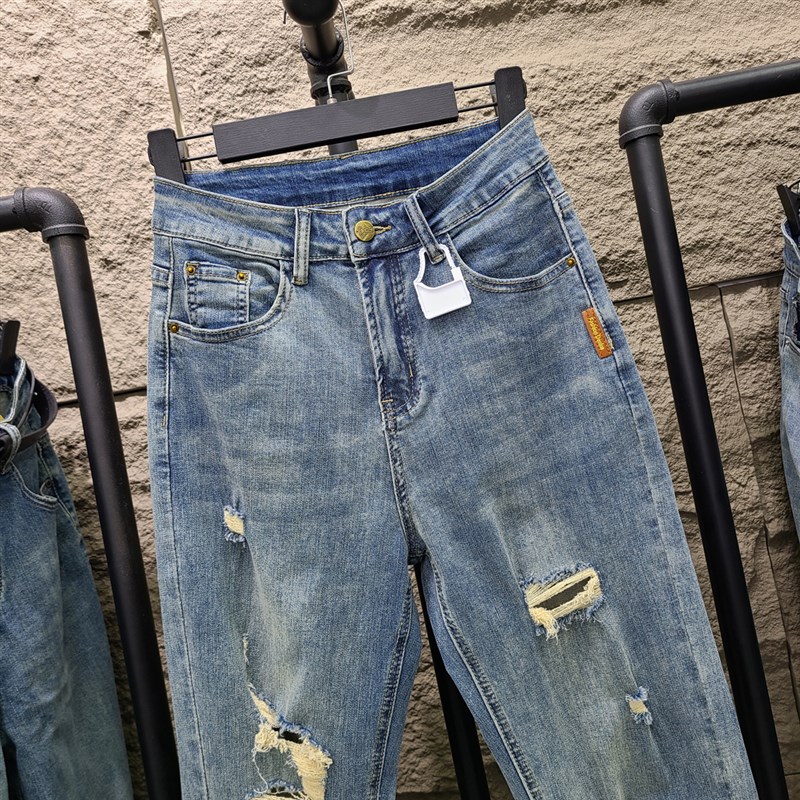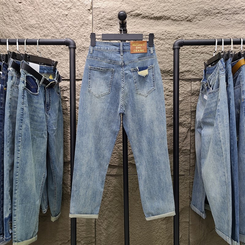 2023春夏新款蓝色破洞牛仔裤女薄款九分宽松高腰显瘦哈伦萝卜裤子