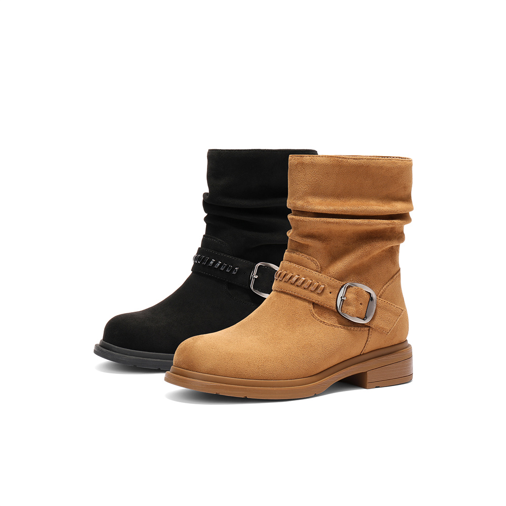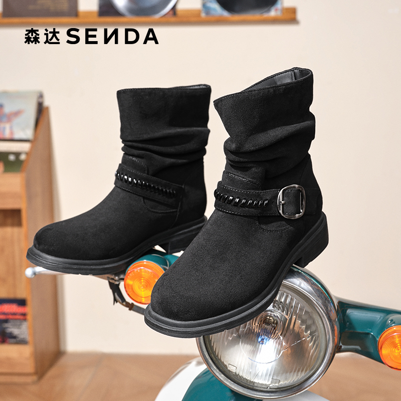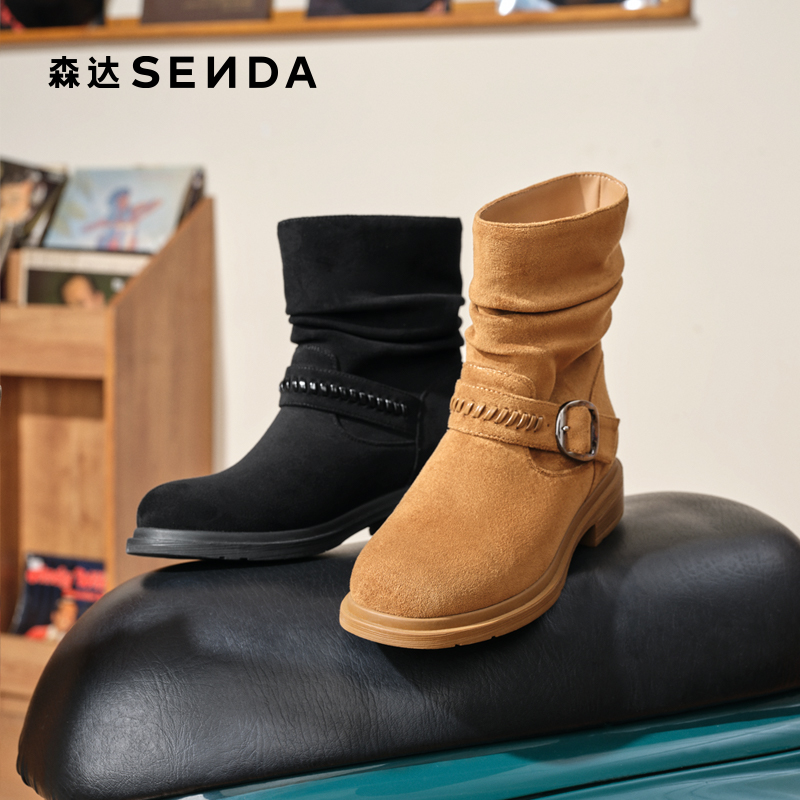 森达西部靴女2025冬季新款复古皮带扣户外休闲堆堆靴中筒靴ZTI44