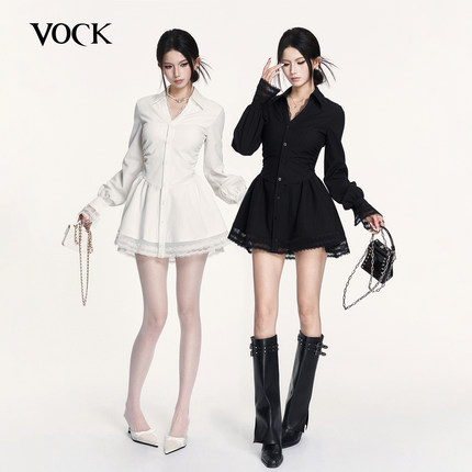 VOCK 夜幕浅奏 法式风浪漫重工拼接蕾丝褶皱收腰衬衫裙子两件套装