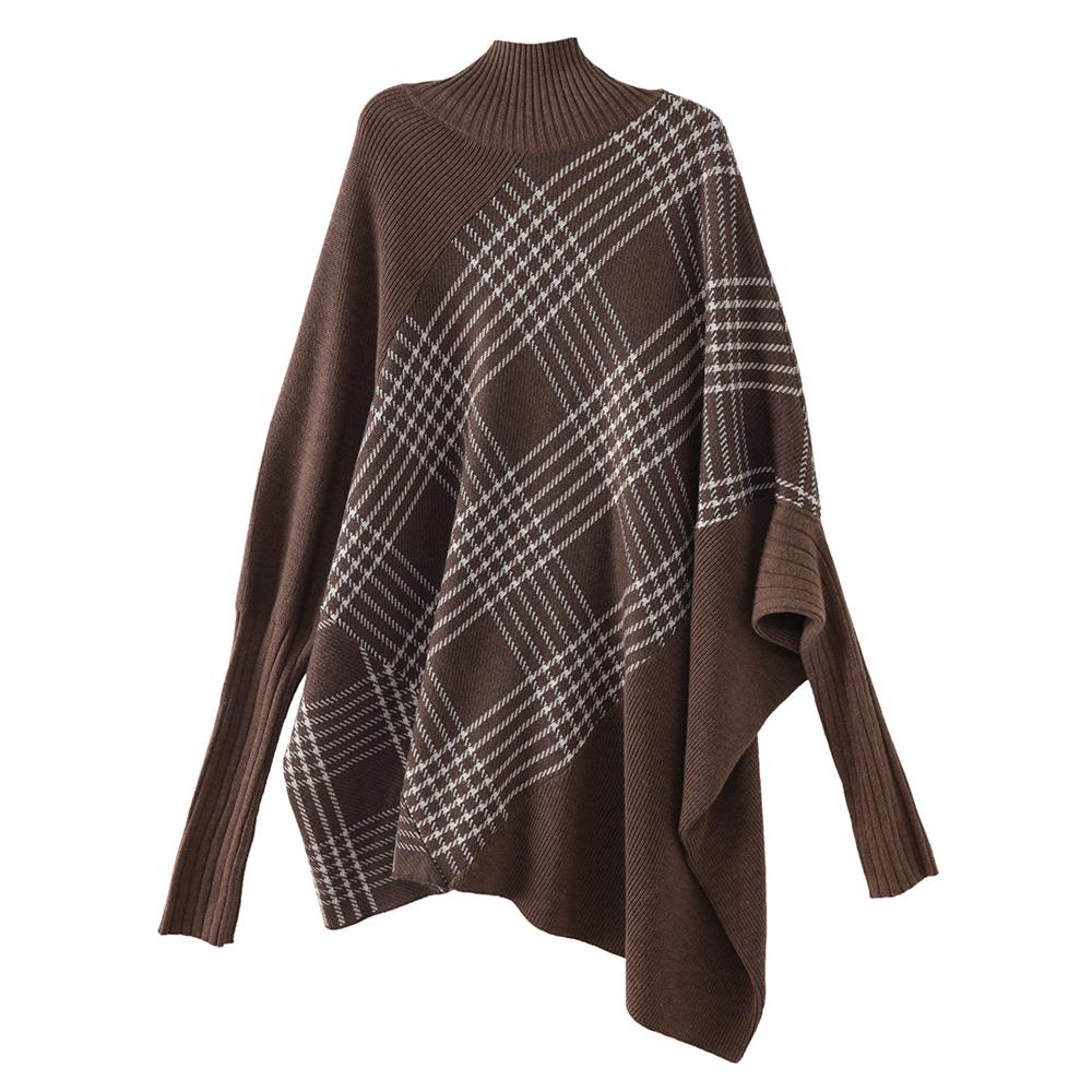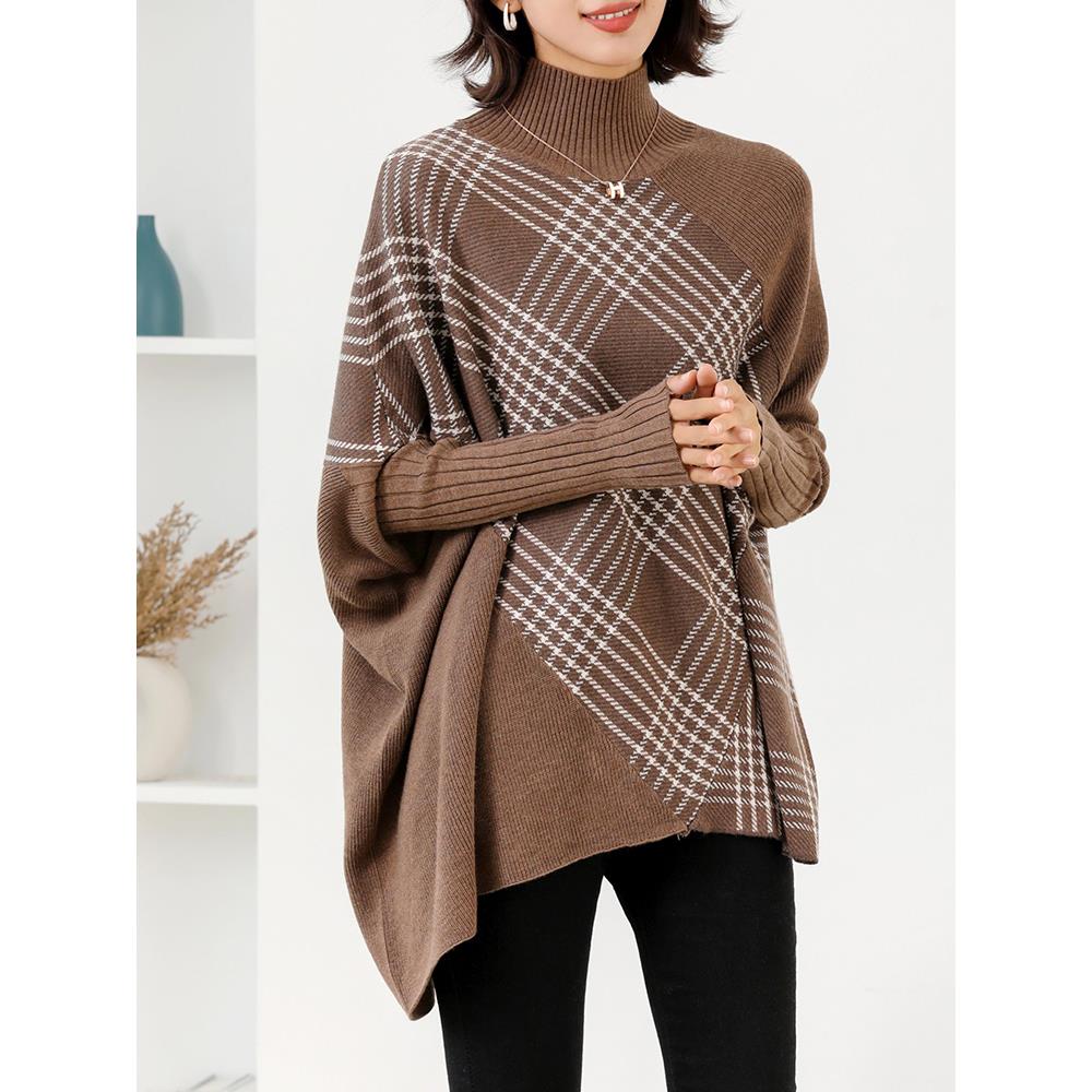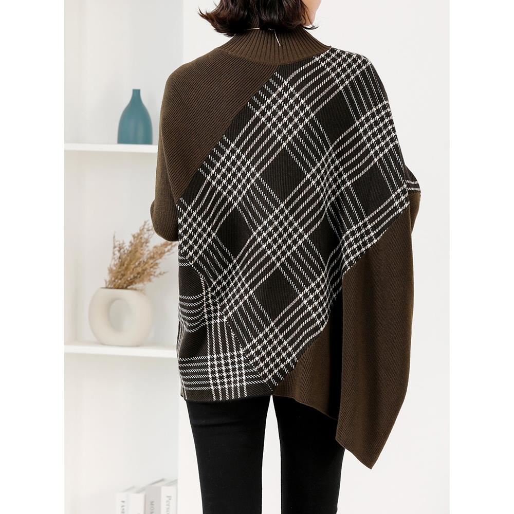 格子拼色针织衫秋冬大码不规则中长款毛衣女慵懒风宽松蝙蝠袖打底