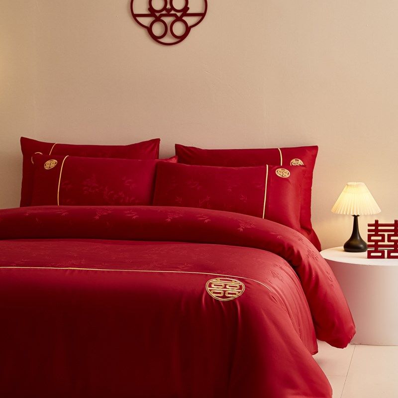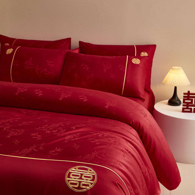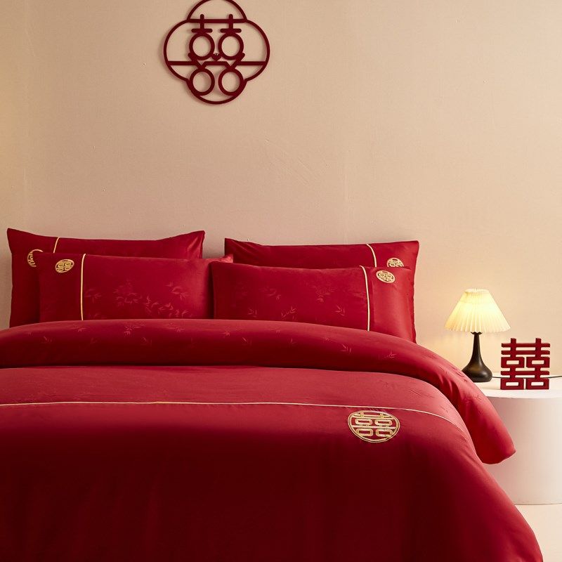 新中式提花结婚四l件套婚庆大红色被套新婚喜被罩床单床上用品