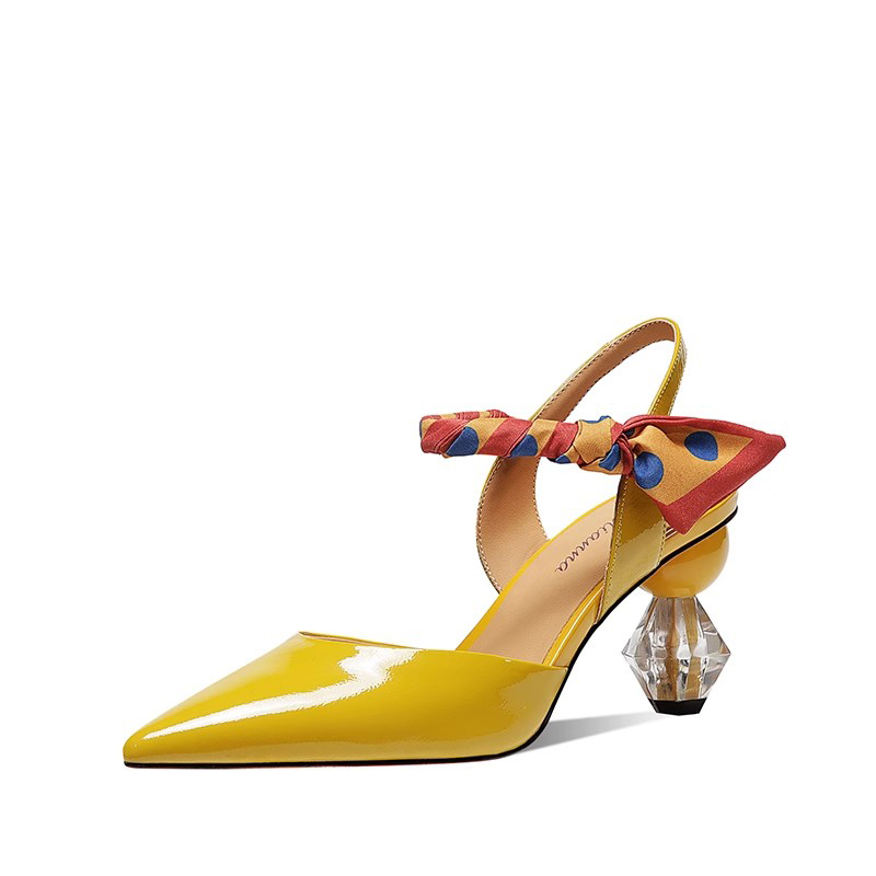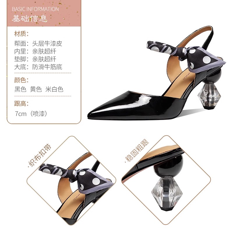 时尚透明粗跟包头凉鞋女2025年夏季新款漆皮一字式扣带尖头高跟鞋