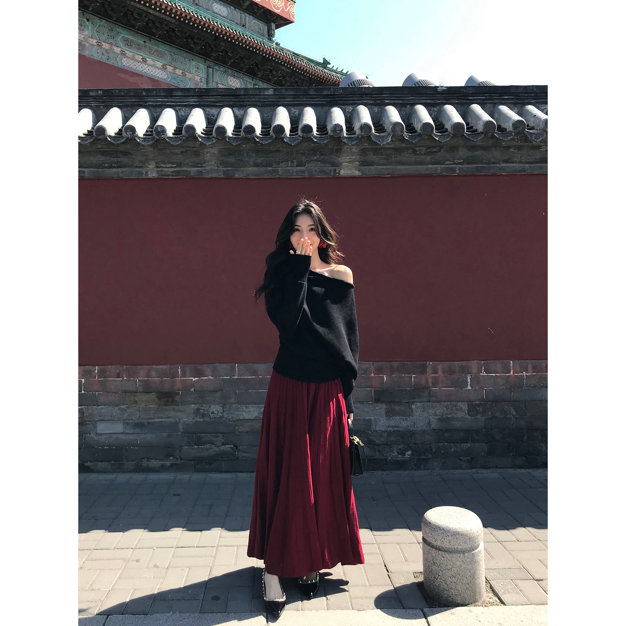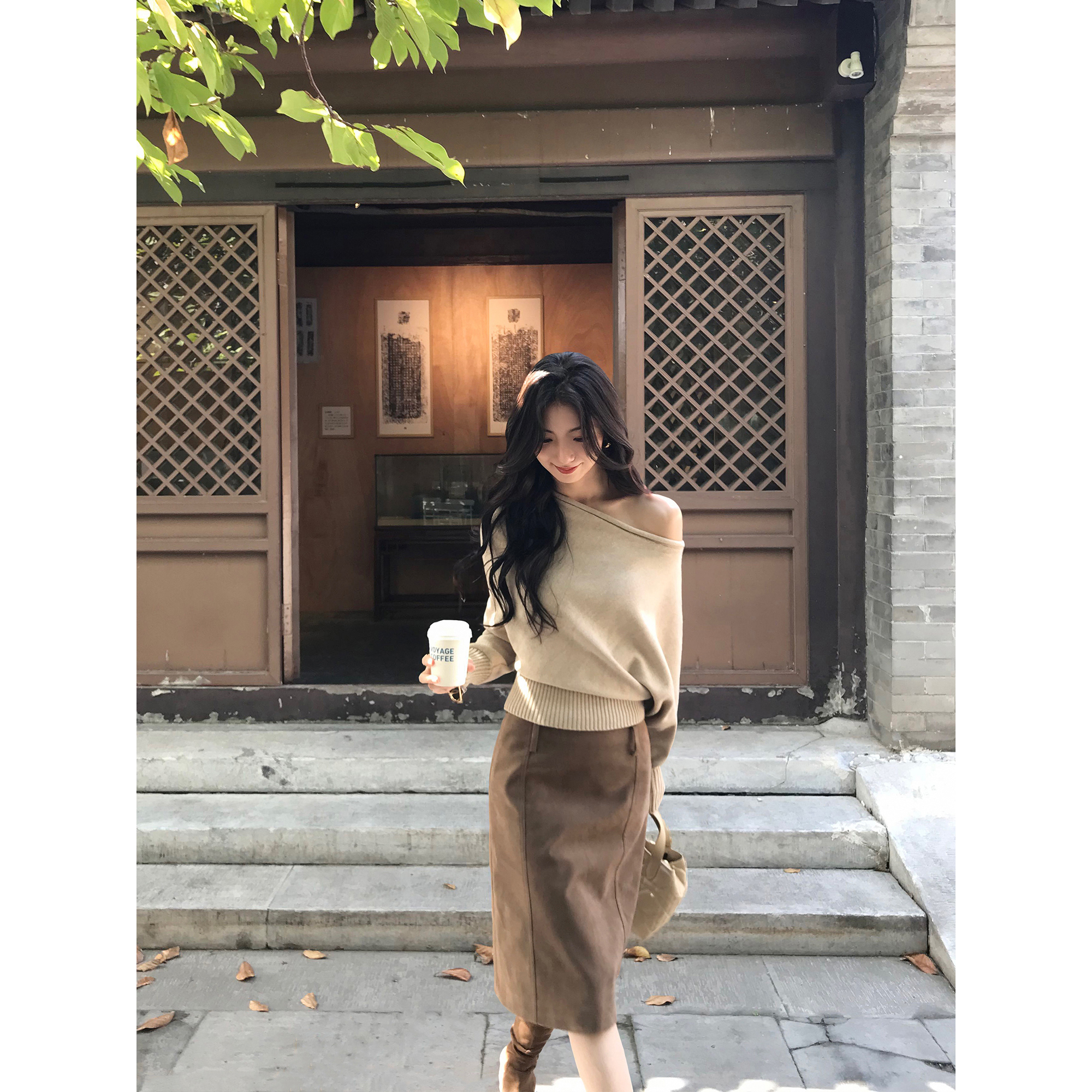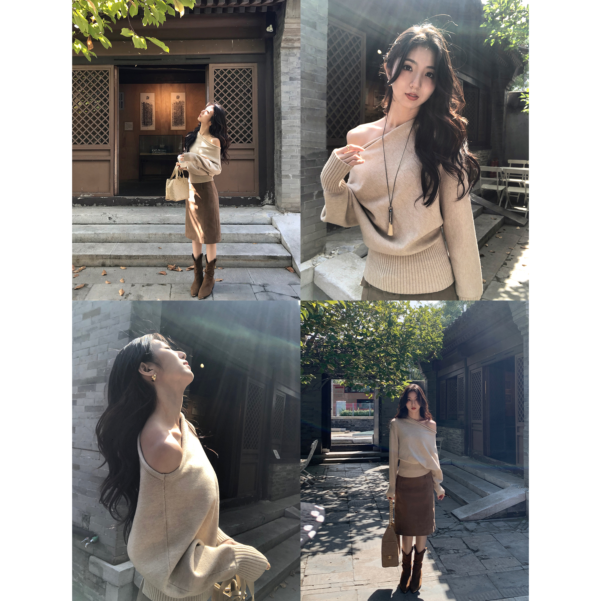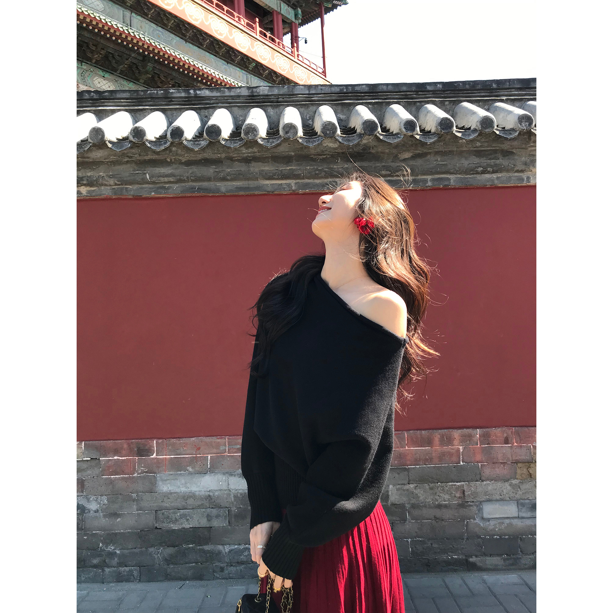 MULVAN 老钱taste 慵懒风气质斜肩针织衫女蝙蝠袖宽松露肩毛衣