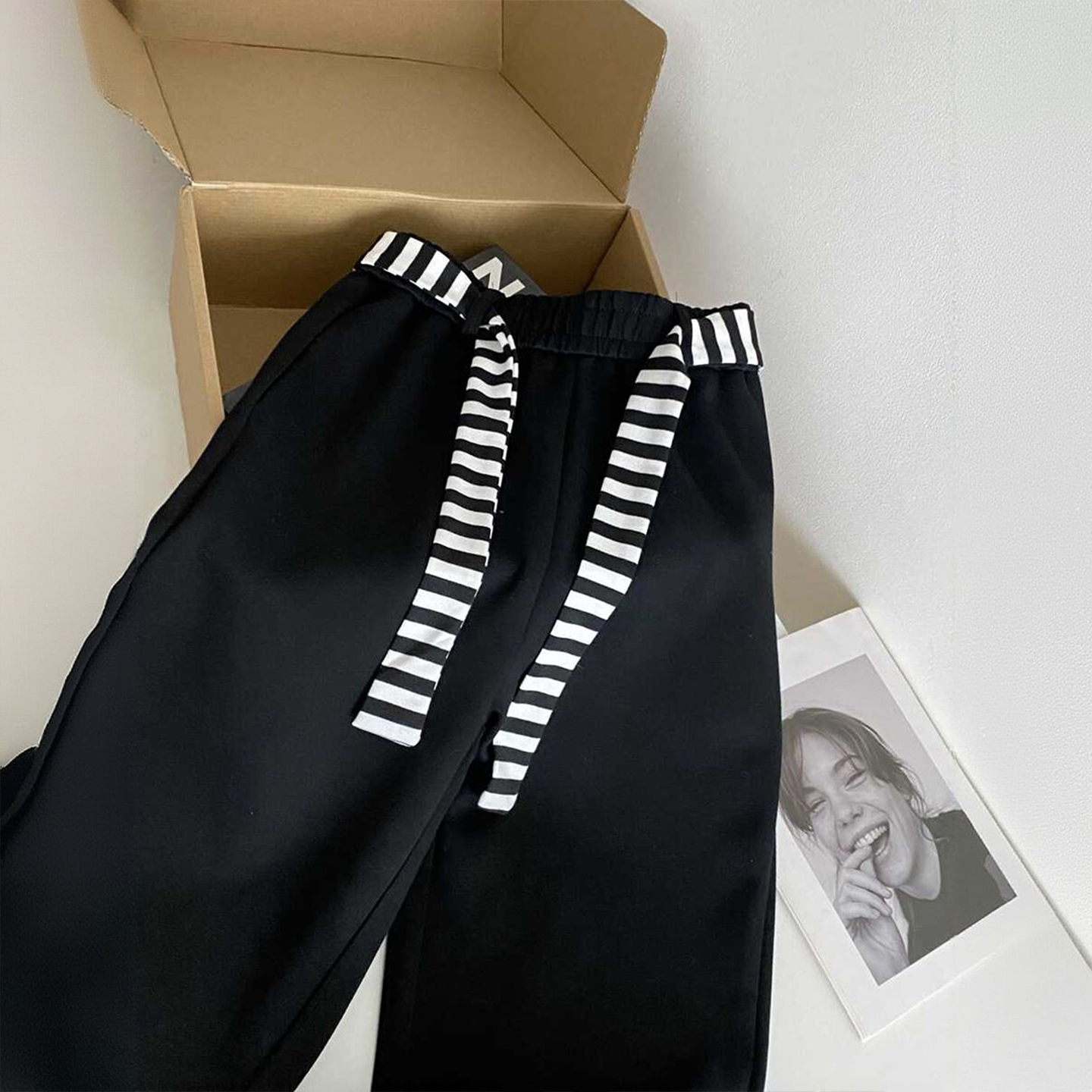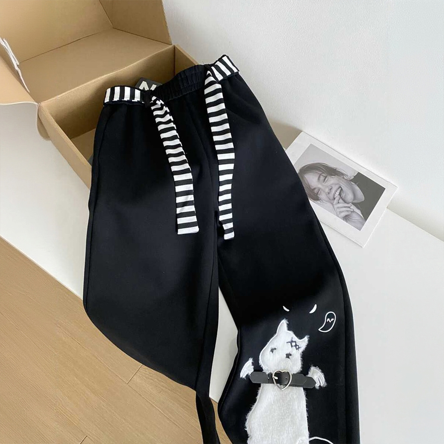 特大码黑色休闲百搭刺绣阔腿卫裤女胖mm学生简约风遮肉显瘦长裤子