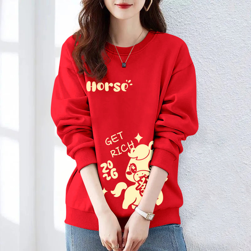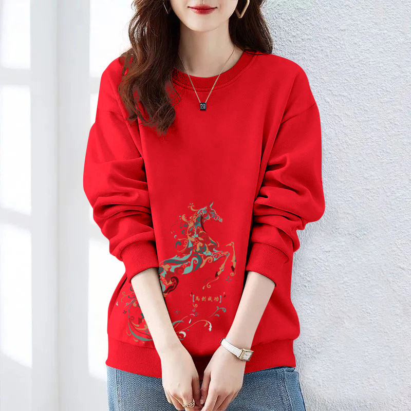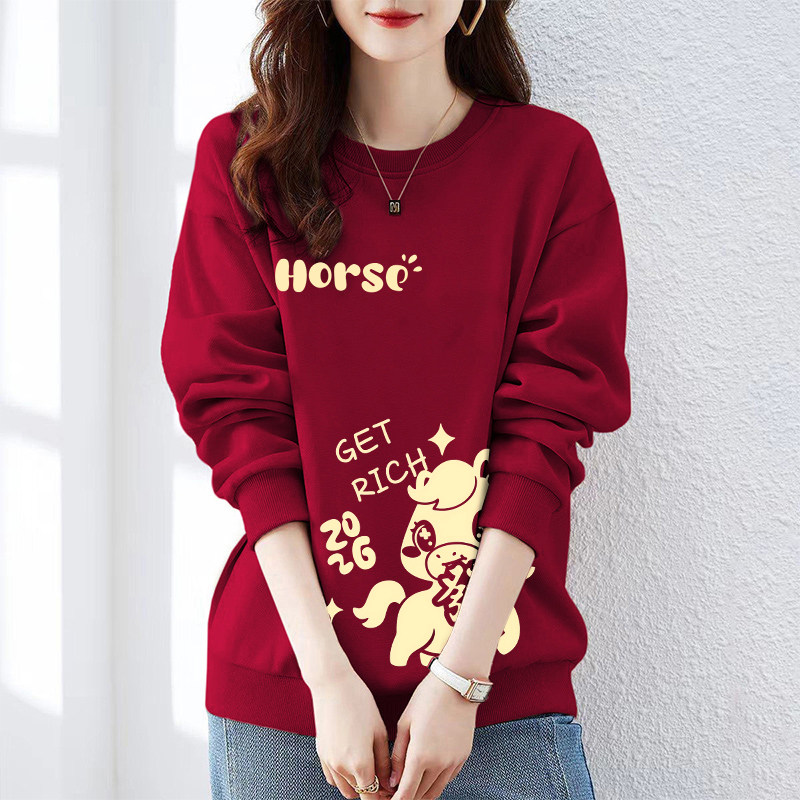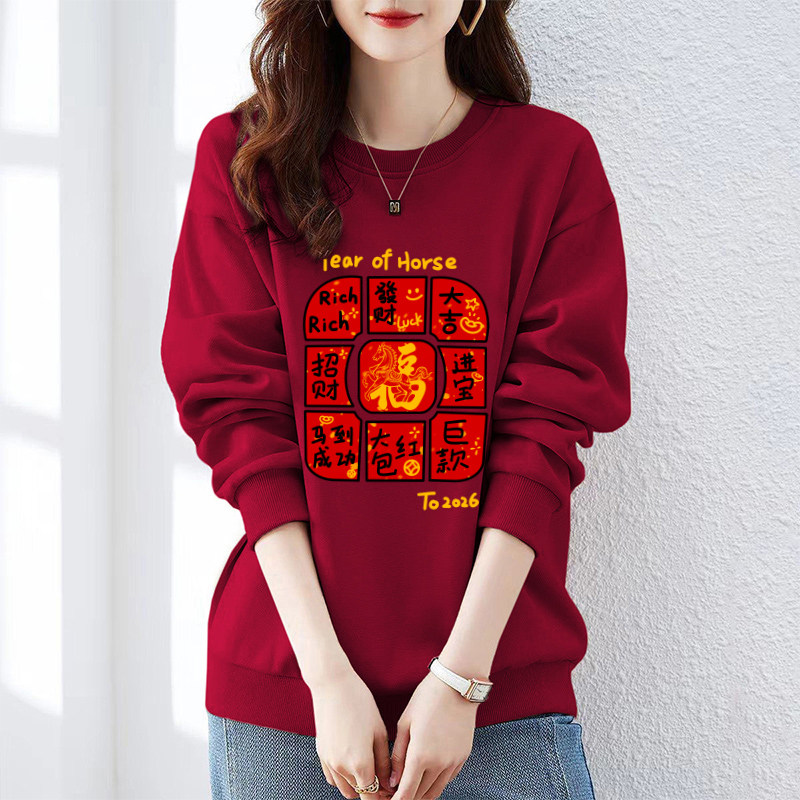 秋季新款酒红色圆领加绒卫衣女款2026马年本命年衣服设计感上衣潮