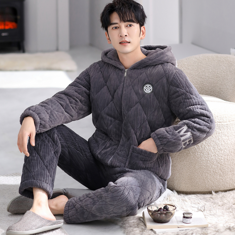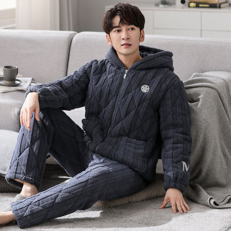 芬腾睡衣男士冬季三层加厚加绒珊瑚绒夹棉青年保暖连帽家居服套装
