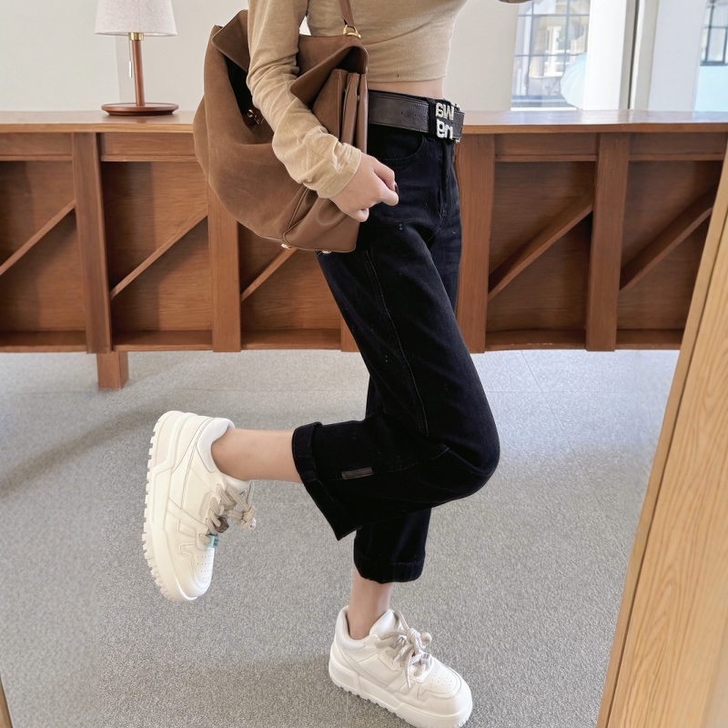 2025春季新款磨砂黑色直筒牛仔裤女九分高腰显瘦休闲阔腿法棍裤子