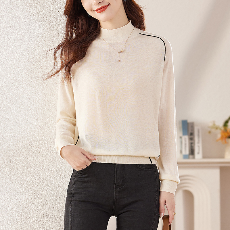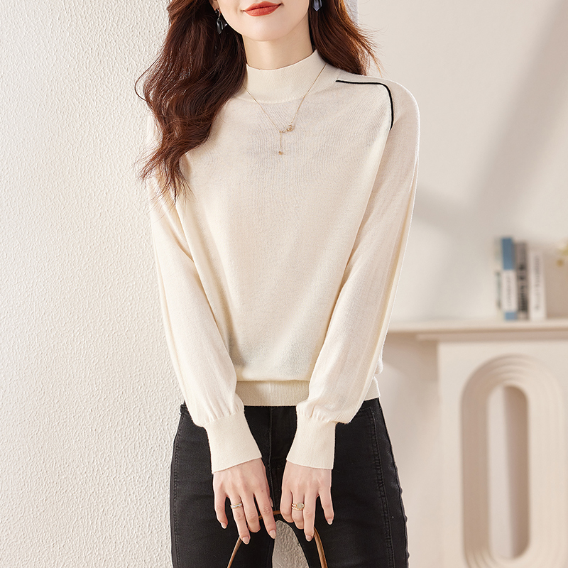 恒源祥集团彩羊100%纯羊毛衫女半高领短款套头打底衫纯色拼接毛衣