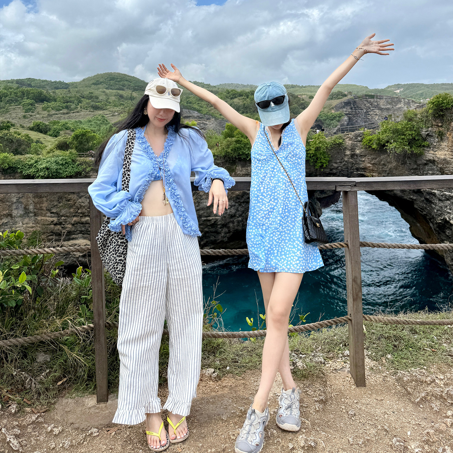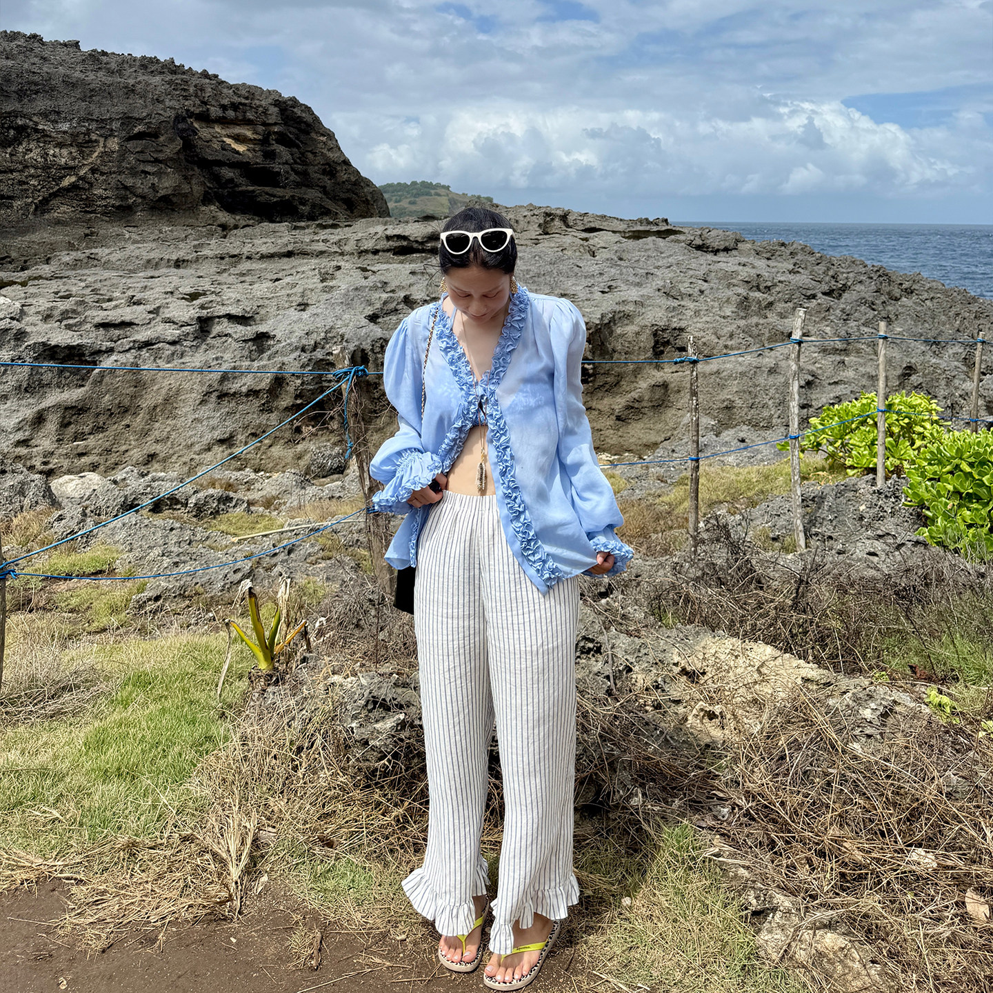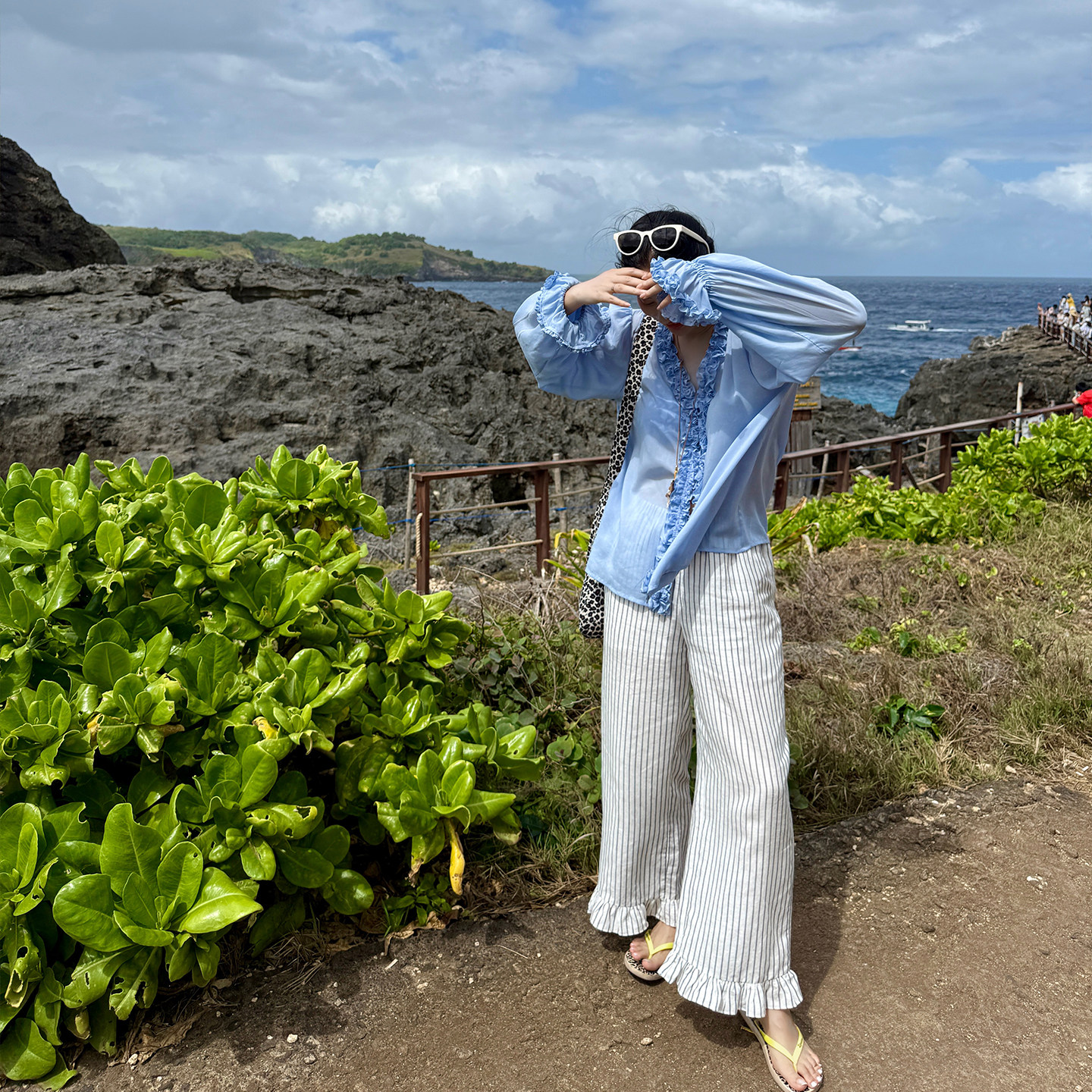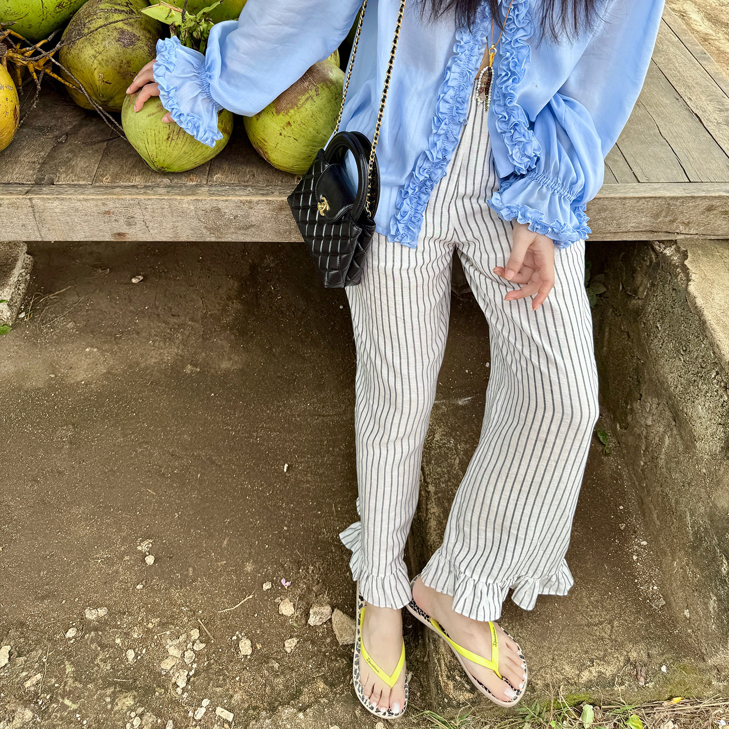 heidy海蒂 智感穿搭 天丝亚麻条纹荷叶边宽松9分裤女显瘦直筒裤子