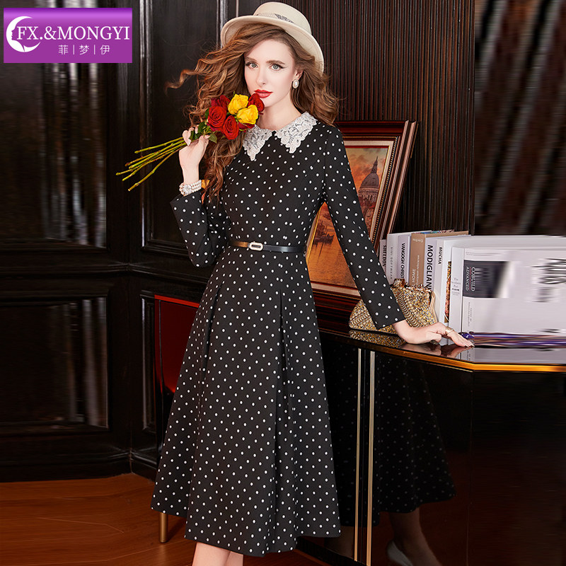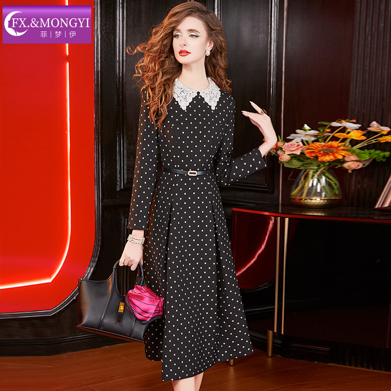 菲梦伊波点黑色衬衫连衣裙女冬装法式赫本风收腰设计感中长款裙子