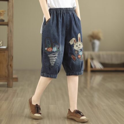 复古贴布刺绣五分牛仔哈伦裤女夏季宽松大码老爹裤休闲显瘦灯笼裤