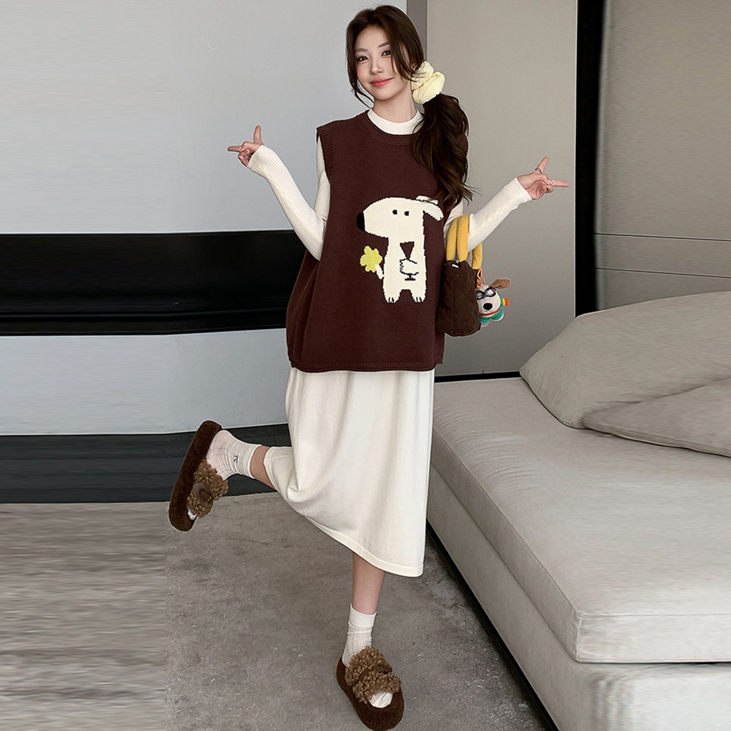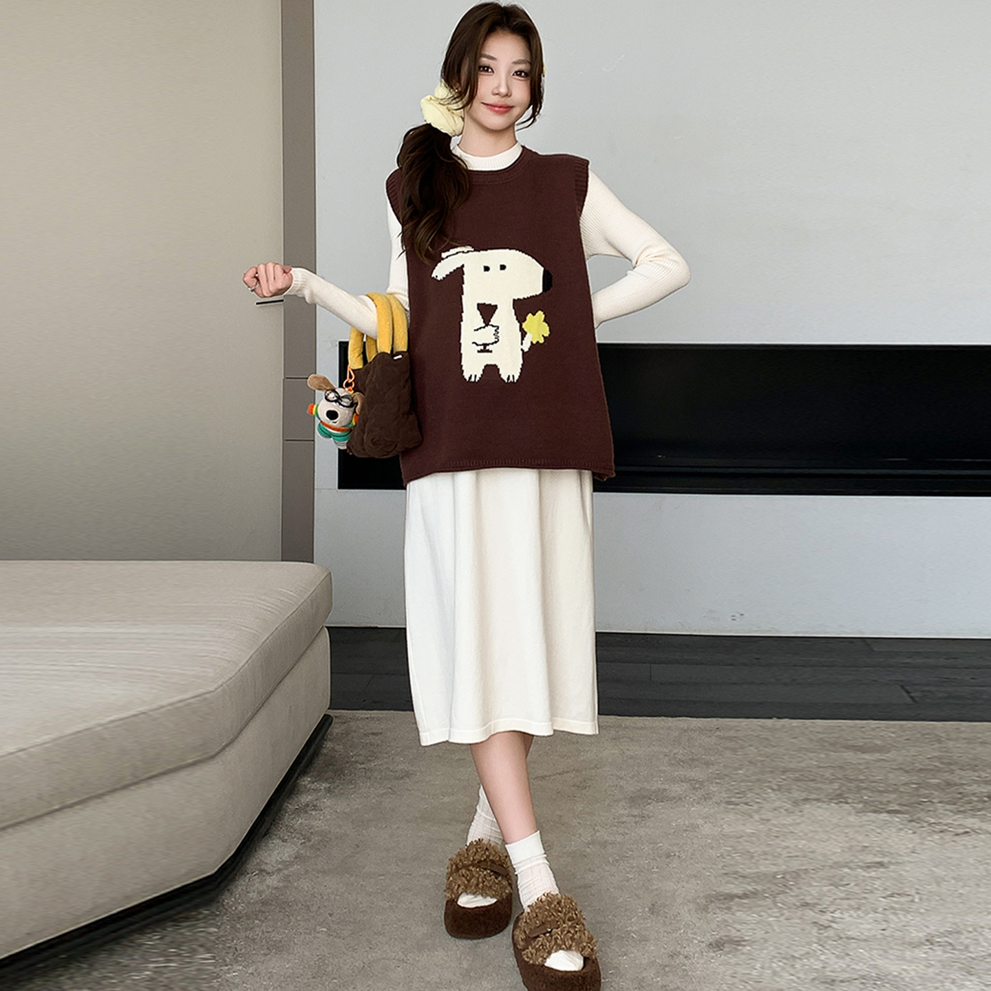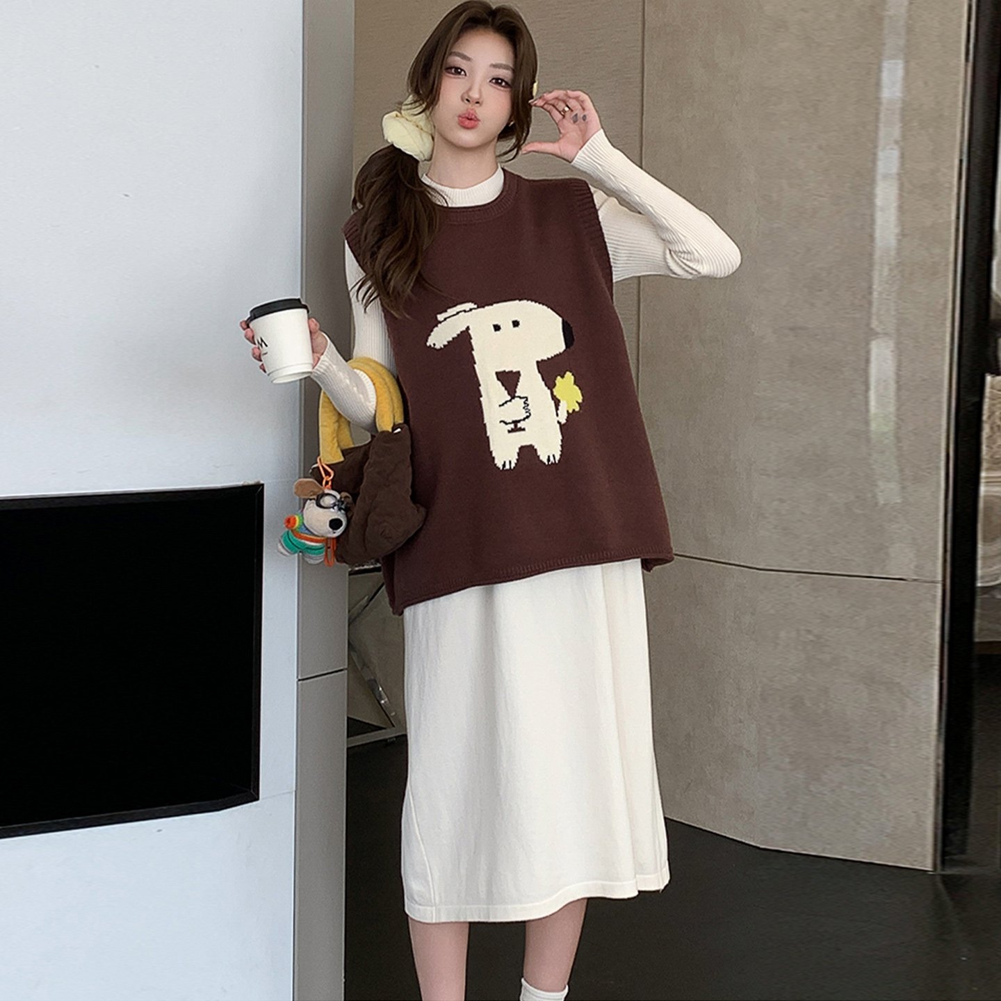 孕妇连衣裙咖色套装秋冬2025新款宽松针织毛衣背心打底裙两件套女