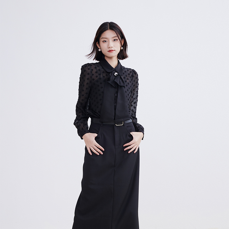梵凯温柔系衬衫女透视雪纺小心机上衣蝴蝶结领花百搭通勤长袖衬衣