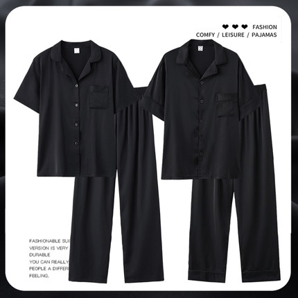 芝桃鸟2025新款夏季冰丝黑色男女款睡衣仿真丝绸短袖长裤情侣套装