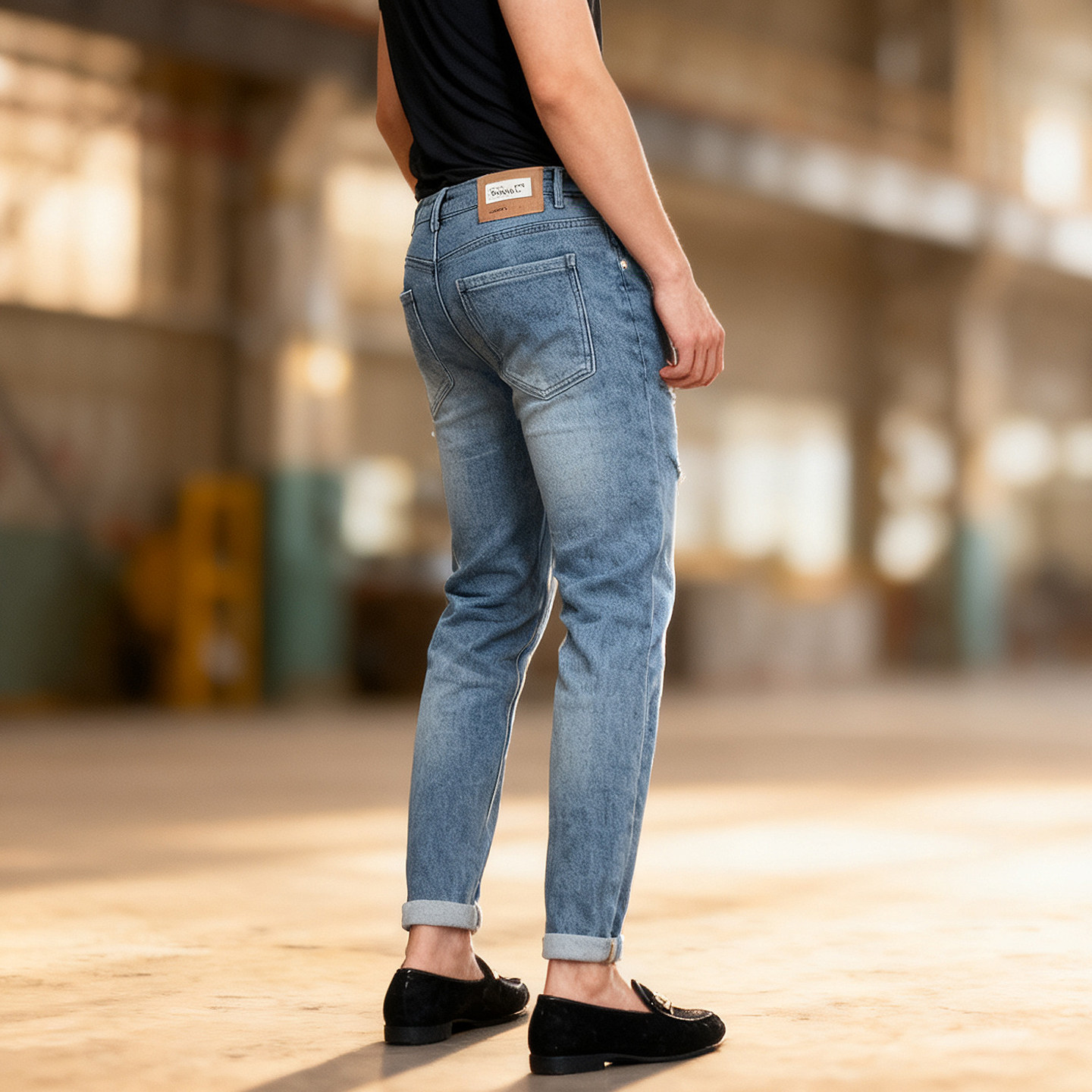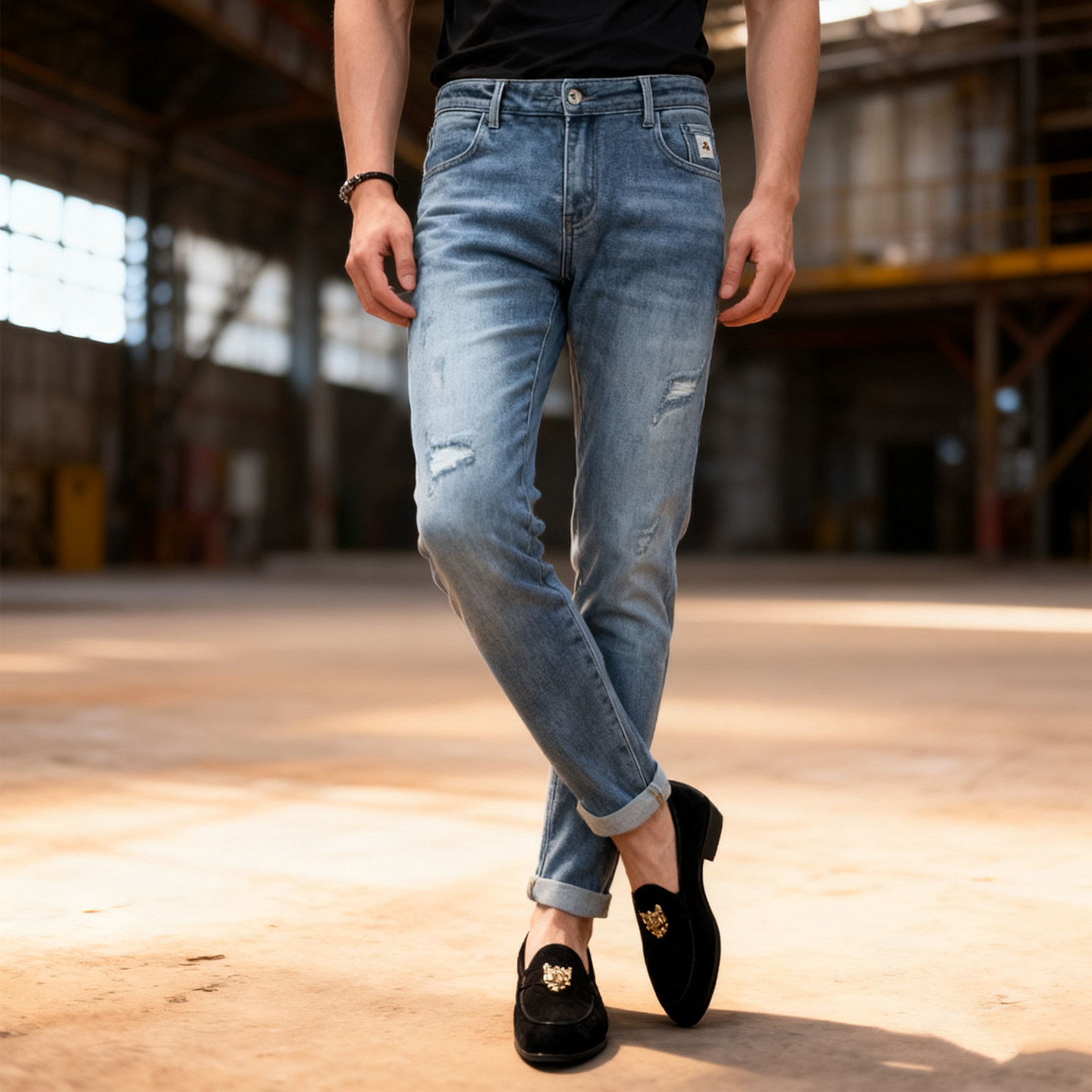 男士冬季加绒浅色破洞潮牌牛仔裤